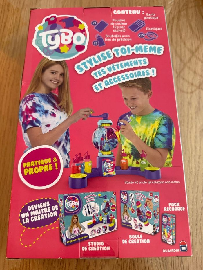 Recharge Tybo – à utiliser avec la machine tie & dye Marque : Dujardin Âge : dès 6 ans Pack recharge contenant 3 couleurs vives (bleu, rouge, jaune) pour la machine Tybo. Permet de styliser vêtements et accessoires avec des effets tie & dye fun ! État : neuf, jamais utilisé À utiliser uniquement avec la machine Tybo.
