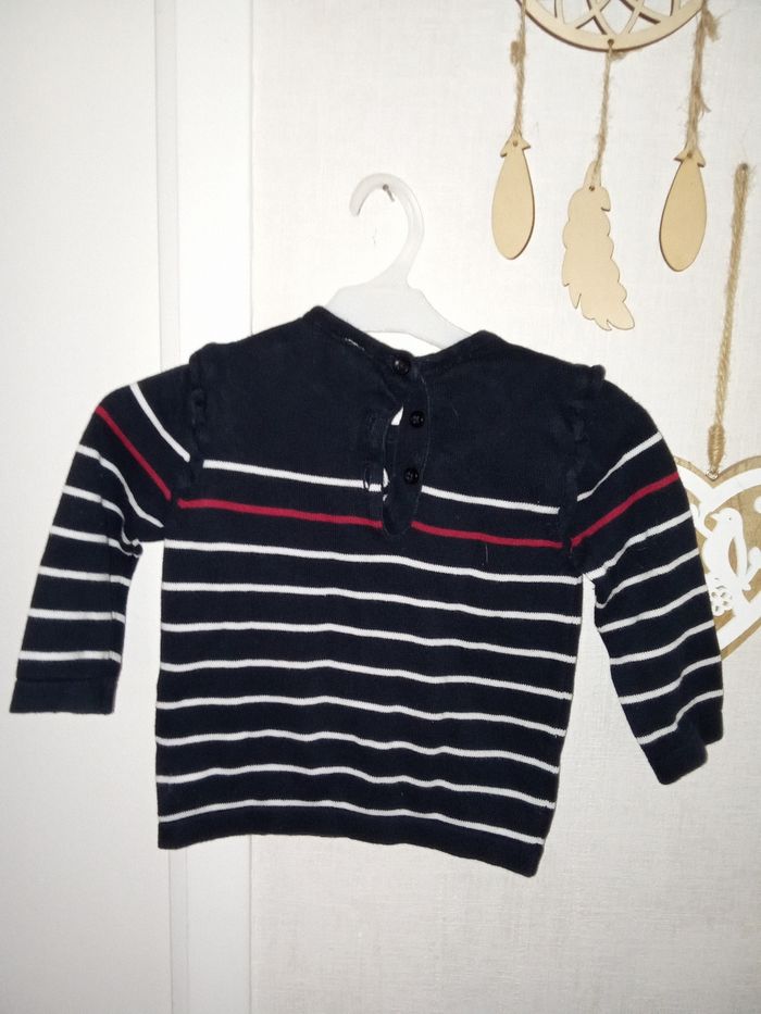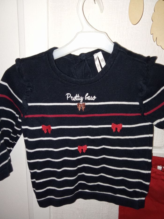 Ensembles en 12 mois comprenant un Pull manche longue Couleur marine rayé blanc broderie noeud et son pantalon rouge avec élastique à la taille. Plutôt hiver Bon état général mm si porté. De nombreux autres ensembles bébé fille mm taille également à vendre ds mon dressing et réduction activée