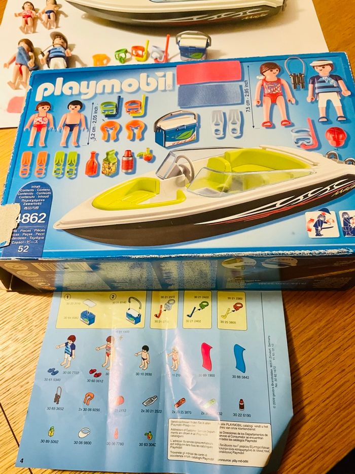 Playmobil 4862 Vedette familiale Avec notice et boîte Contient quatre personnages. Avec de nombreux accessoires et espaces de rangement. La vedette flotte Toute la famille profite de cette belle journée pour faire une sortie en mer. Papa est aux commandes du bateau, les enfants plongent dans l`eau et maman se fait bronzer ! Avec de nombreux accessoires et espaces de rangement (masques, tubas, palmes, jumelles…).