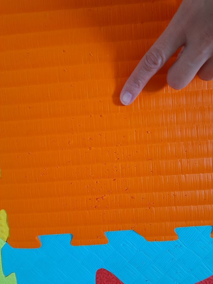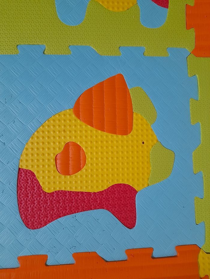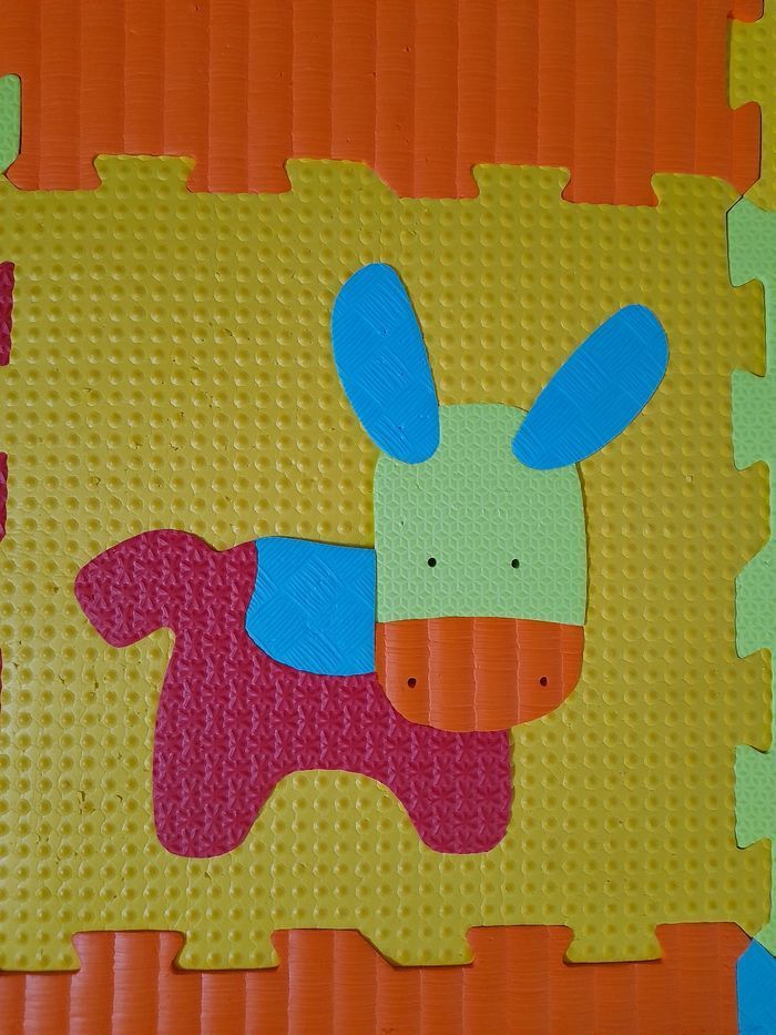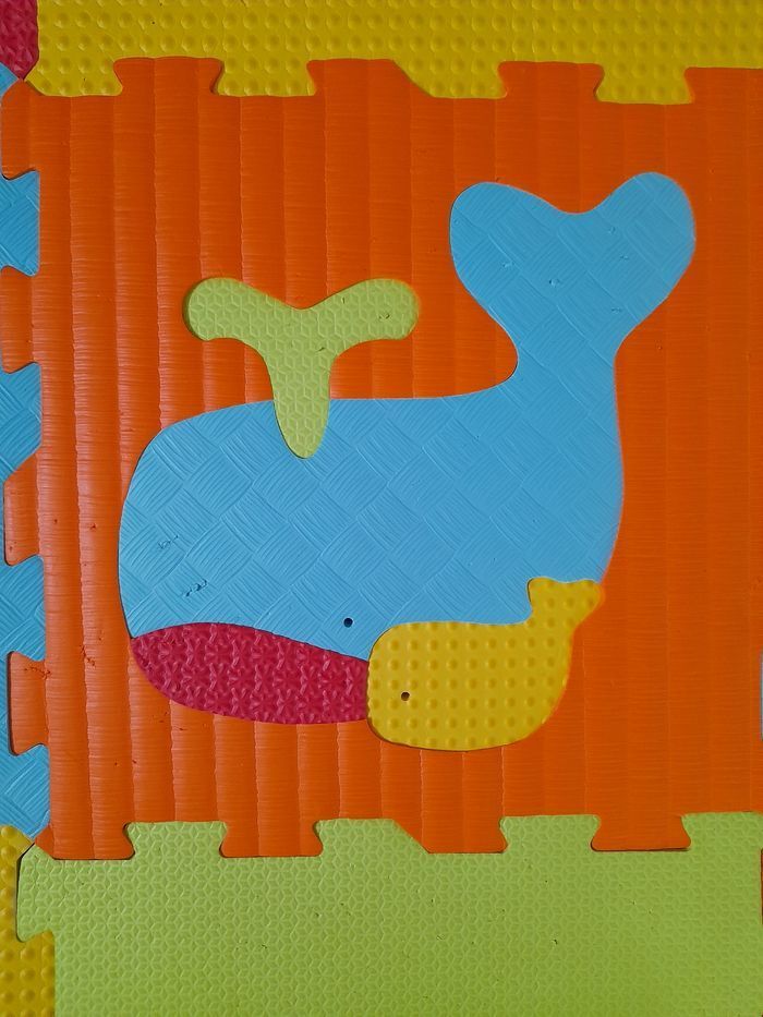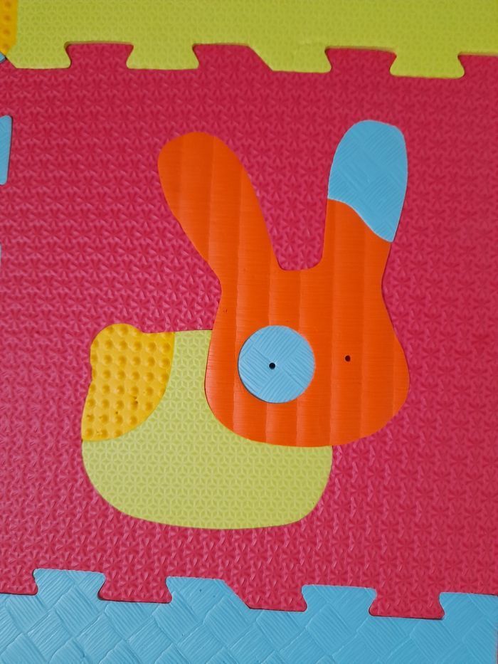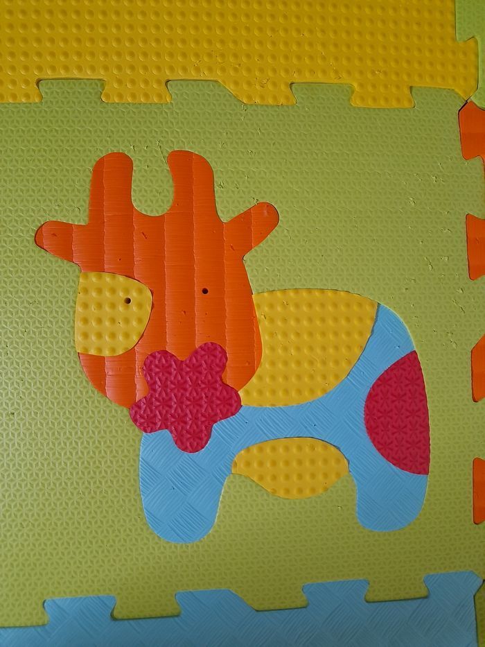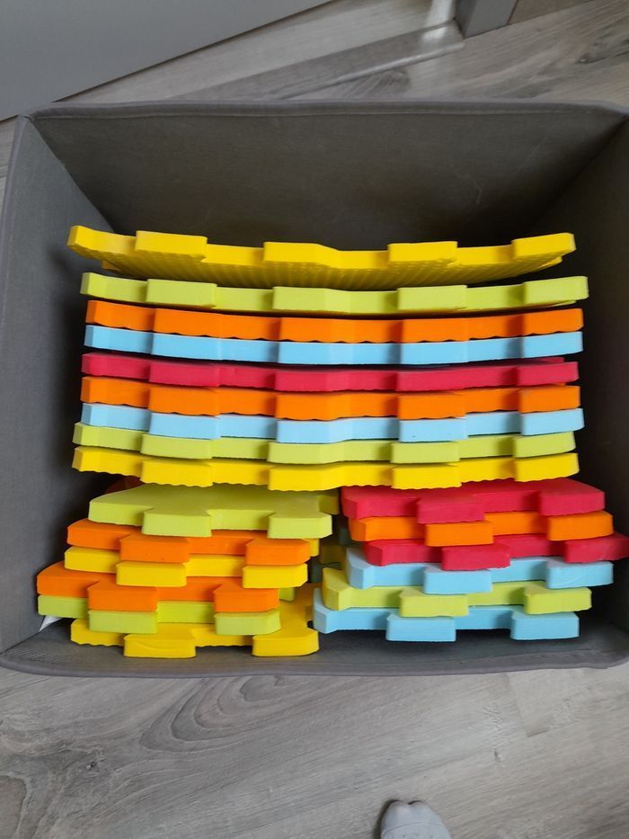 Ensemble de dalles en mousse. Évolutives car quand les enfants sont bébés, nous pouvons les placer à plat au sol pour faire 1 tapis puis lorsqu'ils grandissent les dalles s'emboîtent pour faire un cube. 5 dalles comportent des animaux à encastrement. Quelques griffes de chat sur certaines dalles (voir photo) Ensemble complet et très propre.