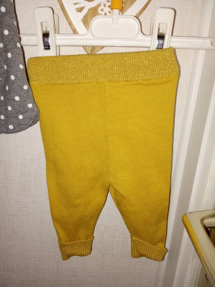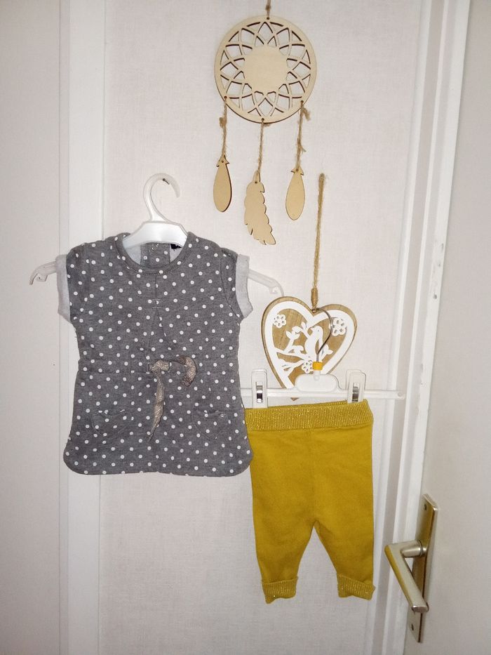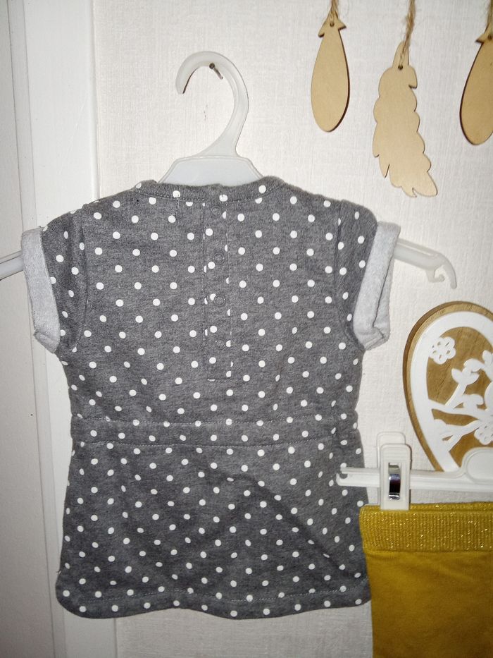 Ensemble 1 mois Kiabi composé d'une robe épaisse manche courte grise à pois blancs et son legging jaune.