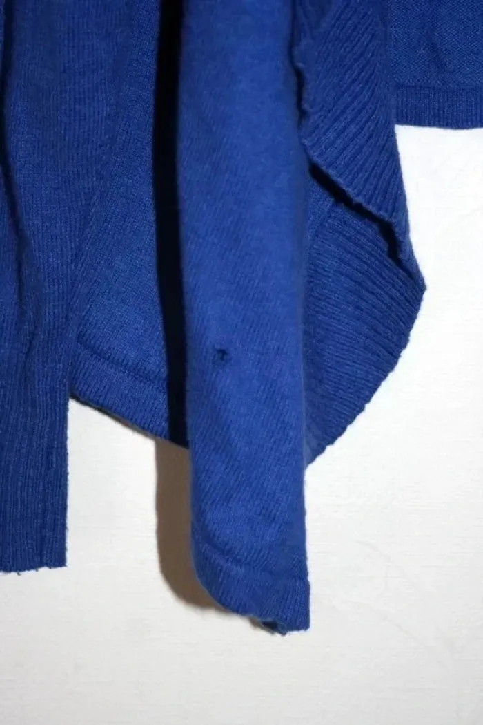 Gilet bleu sans étiquette mais environ 8 ans, plusieurs petits trous cf photo + reprisés également, 220g