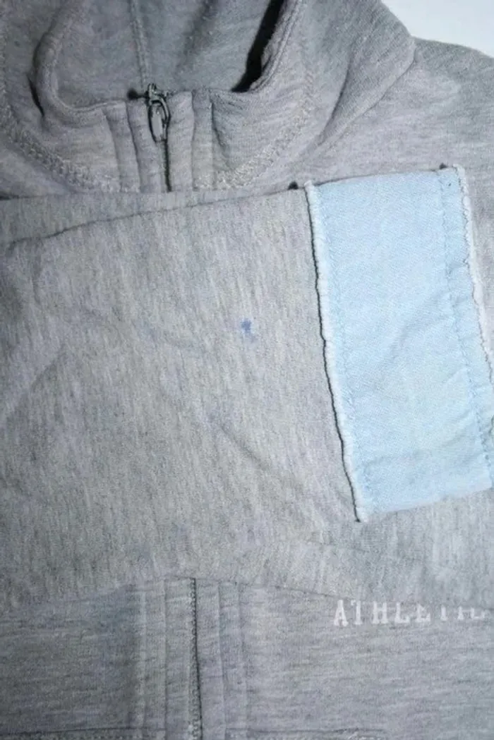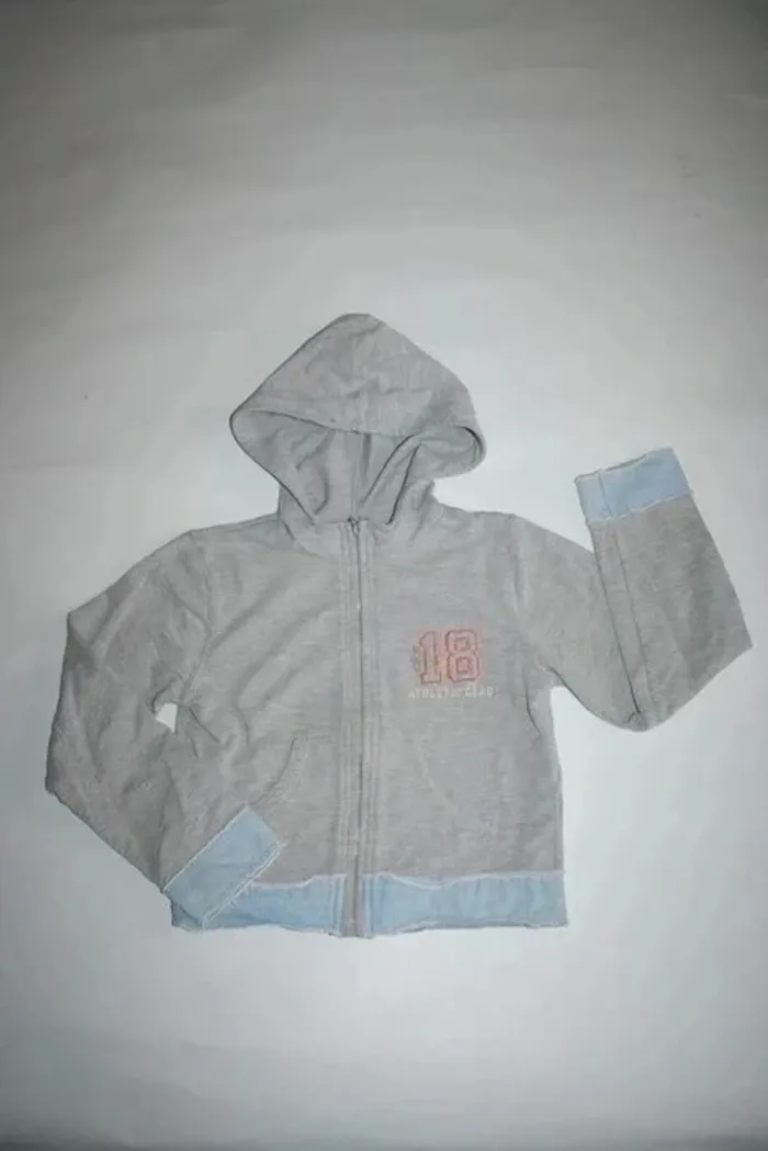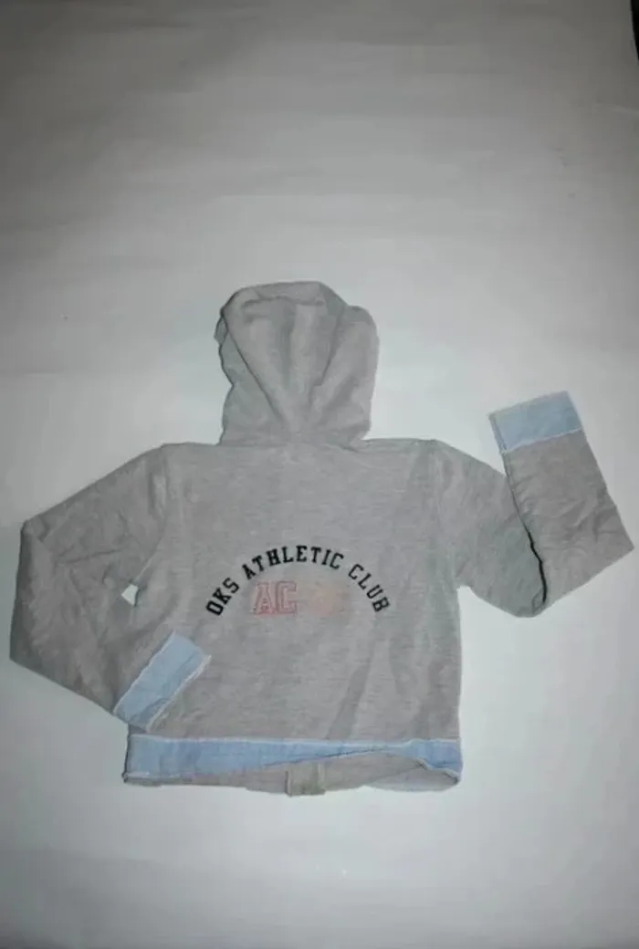 Sweat gris à capuche, Okaidi Sport, petit 8 ans (plutôt 6 ans), bords imitation jeans, petit point de feutre à l'arrière de la manche droite, 200g