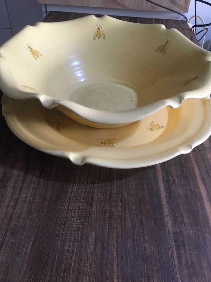 Ensemble saladier Les 2 font 40 cm de diamètre 1 hauteur 12 cm et 1 hauteur 5 cm Fais main à Giens var il y a plus de 40 ans Manque de place chez moi Deco cigale typique de chez nous Alimentaire Magnifique en vrai