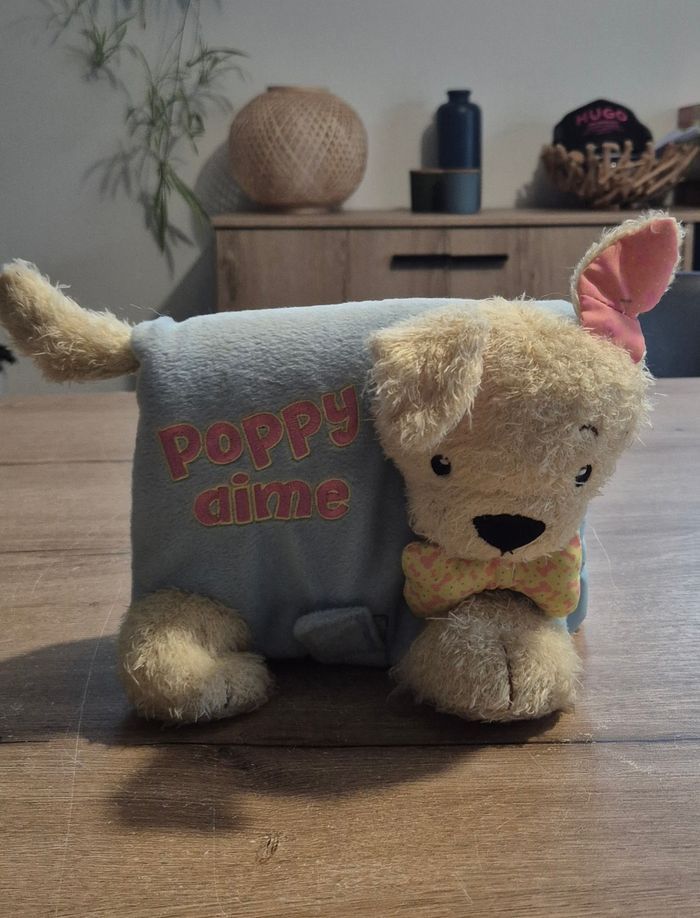 Livre en tissus en forme de chien : Poppy aime Vibre lorsqu'on tire sur son noeud, tient debout Hemma Bon état (petites tâches à l'arrière, voir dernière photo)