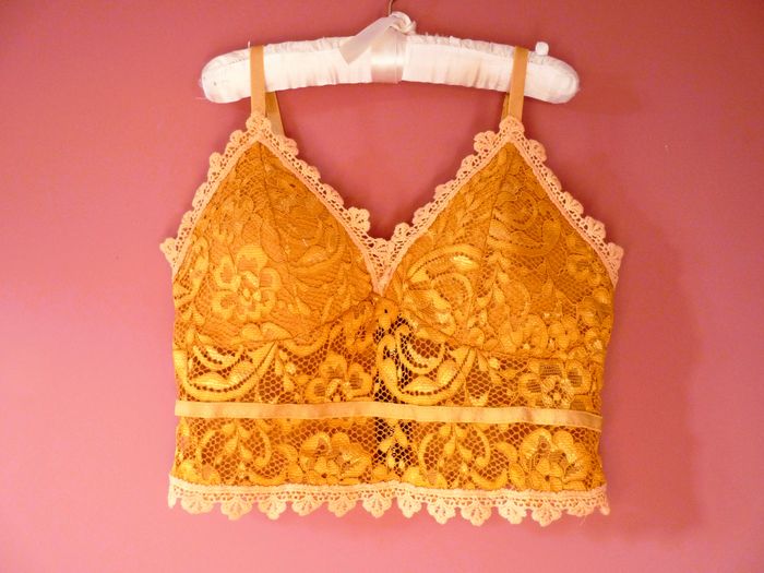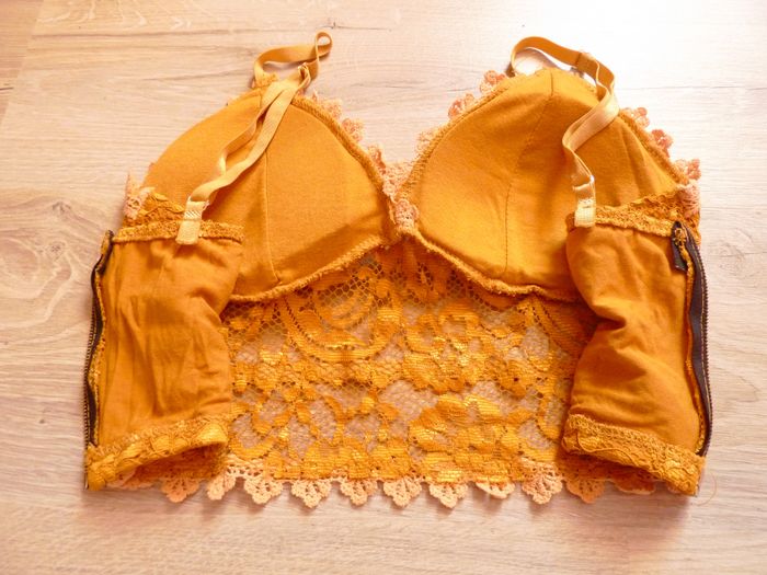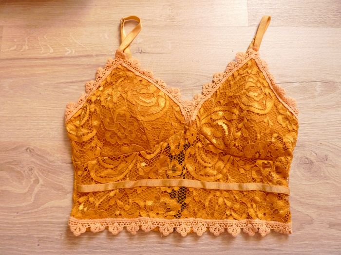 Haut dentelle - collection été Débardeur femme TBE, Top en dentelle couleur jaune moutarde Bretelles réglables Bon maintien de la poitrine Longueur : 40 cm Taille S ou 36 92 % nylon + 8 % elasthane envoi ok