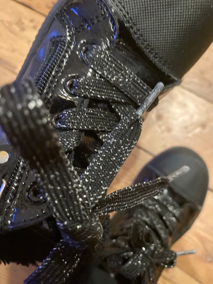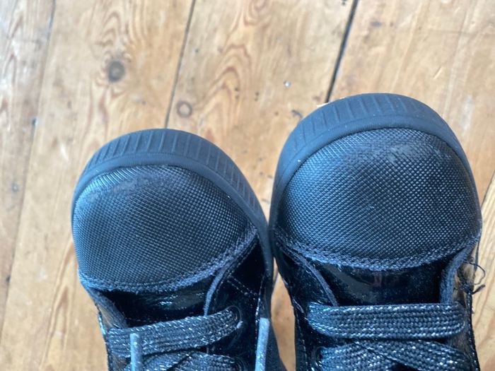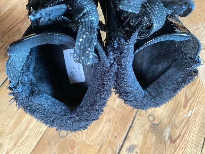 Légères usures sur les bouts devant sinon tres bon état général Baskets bébé fille mid-cut et fourrées avec détails coeurs vernis et scintillants noir Tirette facilitant le chaussant Col duveteux et languette moussés Intérieur chaudement doublé Semelle intérieure finement rembourrée Fermeture à zip latéral + laects 5 oeillets métallisés