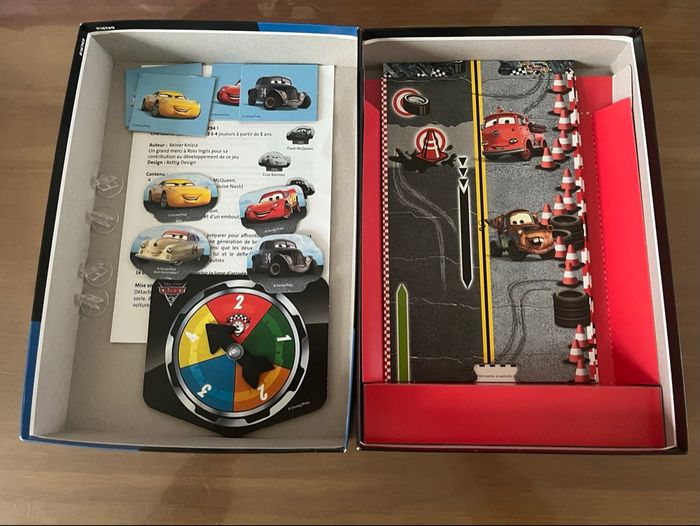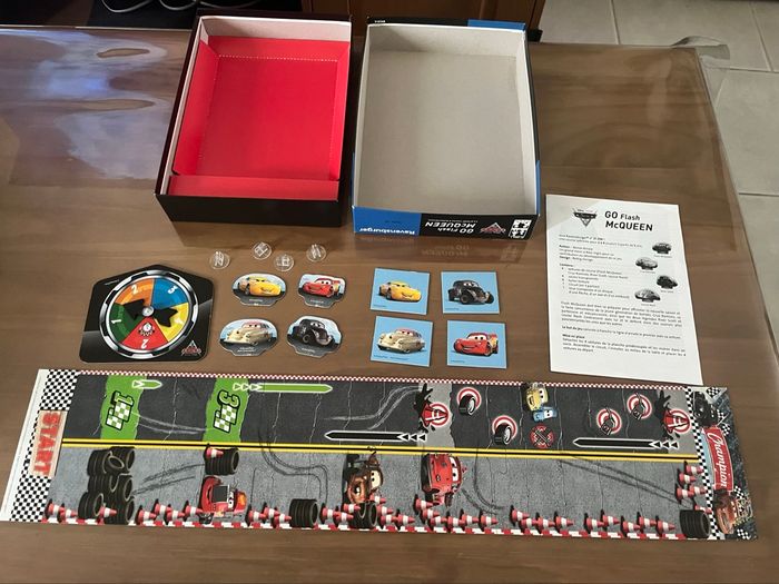 Jeu ayant très peu servi, complet et en très bon état. Juste la boîte légèrement gondolée. Jeu Go Flash MC Queen à partir de 5 ans pour jouer de 2 à 4 personnes, le plateau de jeu est en trois parties façon puzzle, 4 pions représentant Flash Mc Queen,Cruz Ramirez, River Scott et Louise Nash. 1 roue avec une flèche pour avancer.
