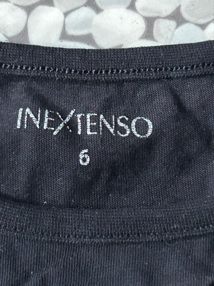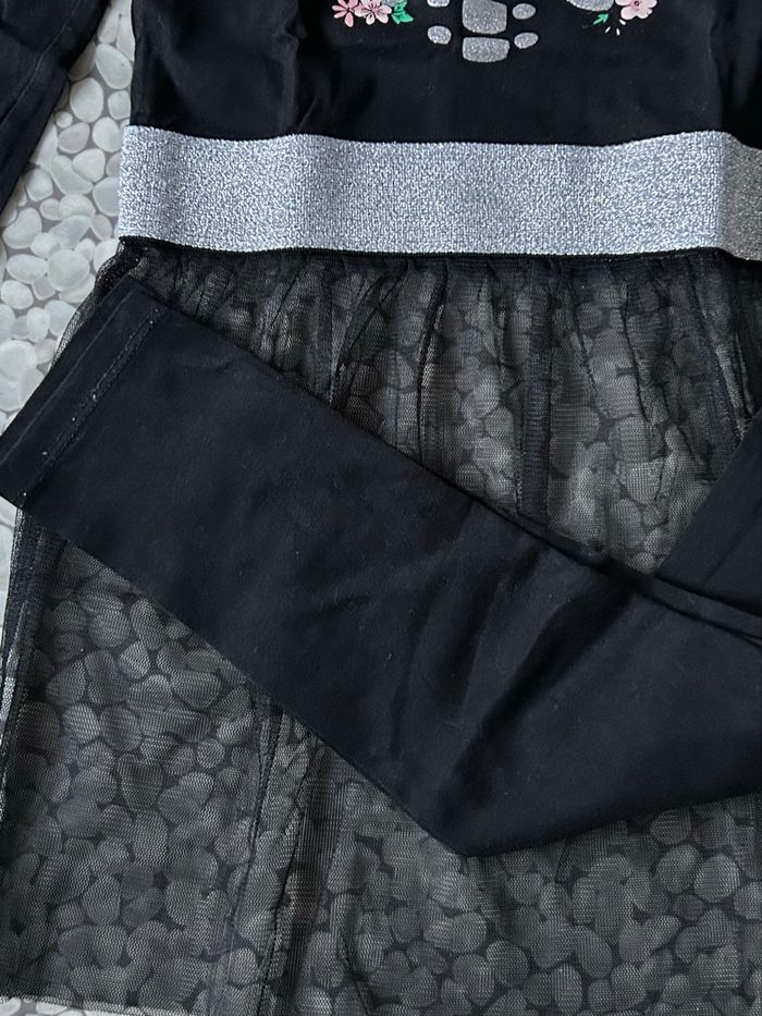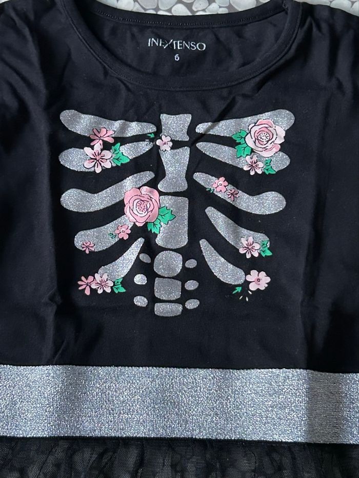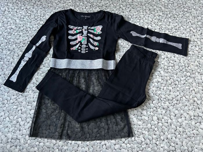 pyjama 2 pièces pour fille, noir avec motifs squelette Halloween. Taille 6 ans, de la marque « In Extenso ». Haut décoré de motifs squelettiques fleuris avec paillettes et avec jupon en tulle transparent, agrémenté d’une ceinture élastique argentée. Se porte sur un legging noir uni. En très bon état.