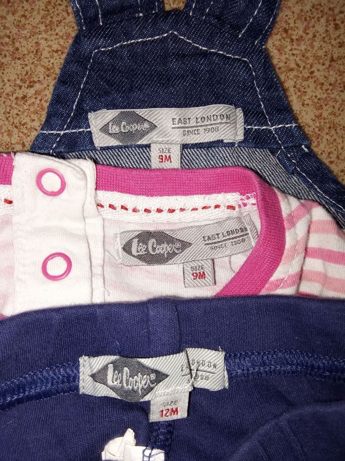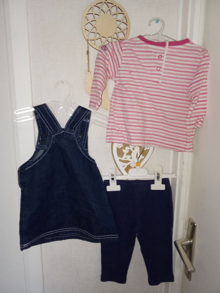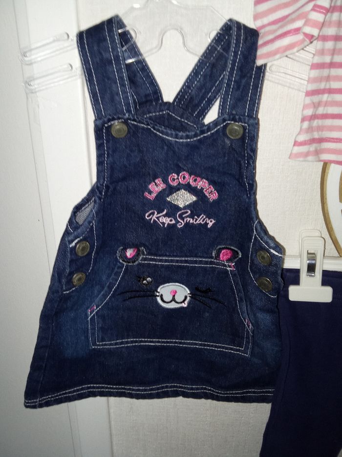 Ensemble lee Cooper composé d'une robe salopette, d'un pull blanc rayé rose ( tâche au dos) en 9 mois et d'un legging marine en 12 mois. Bon état général. De nombreux autres vts bébé fille mm taille également à vendre ds mon dressing et réduction activée