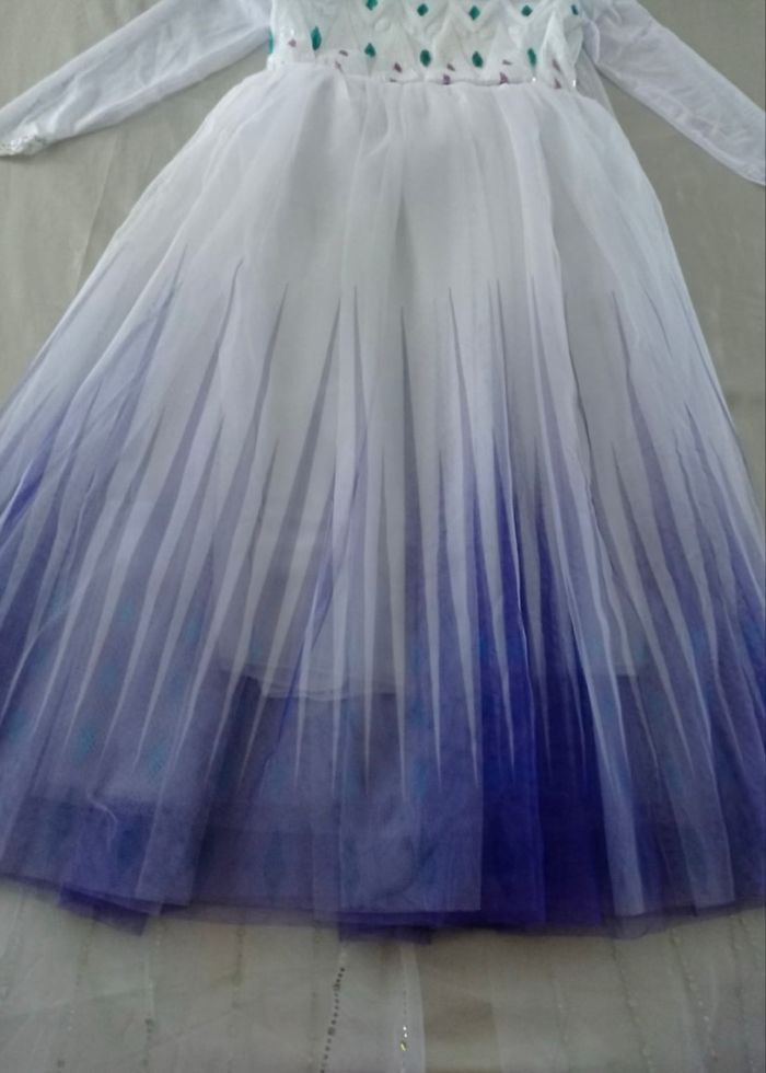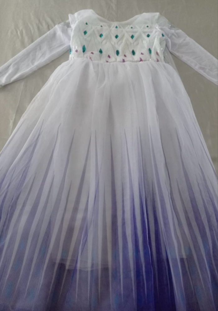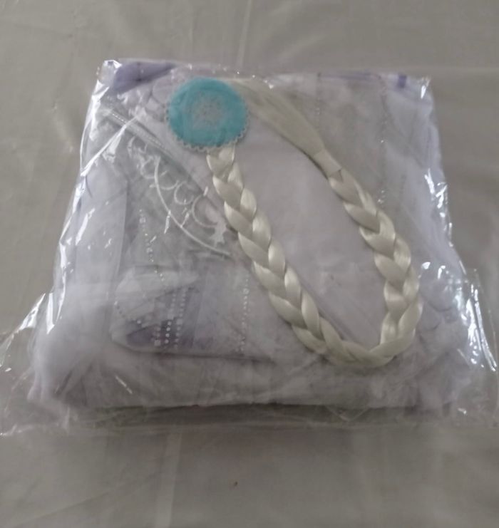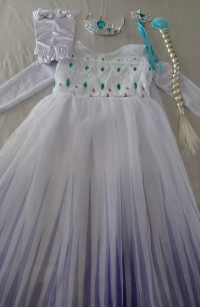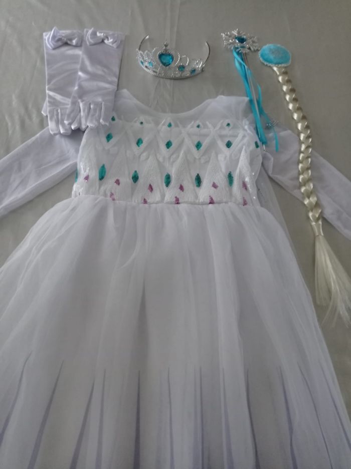 Déguisement robe princesse Elsa blanche et ces accessoires (couronne, baguette, gants, tresse). La robe mesure 95cm, la taille convient aux petites filles de 6ans. Totalement neuve, vendue dans son emballage d’origine. Expédition rapide après votre commande