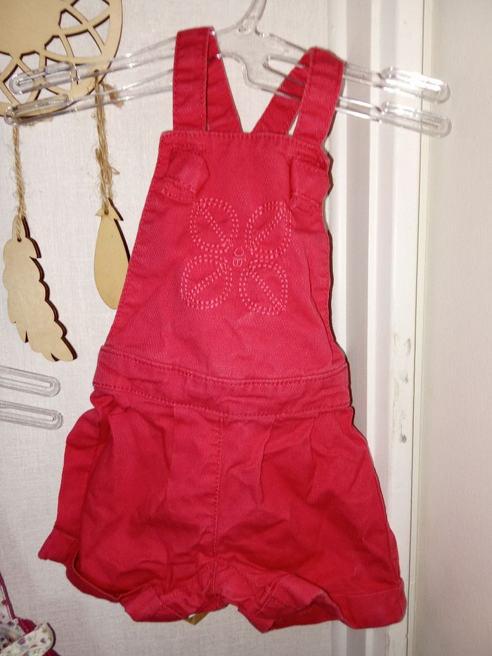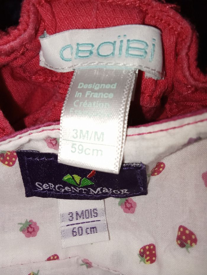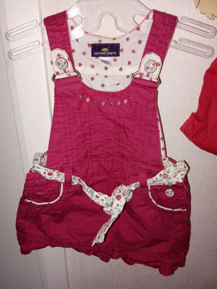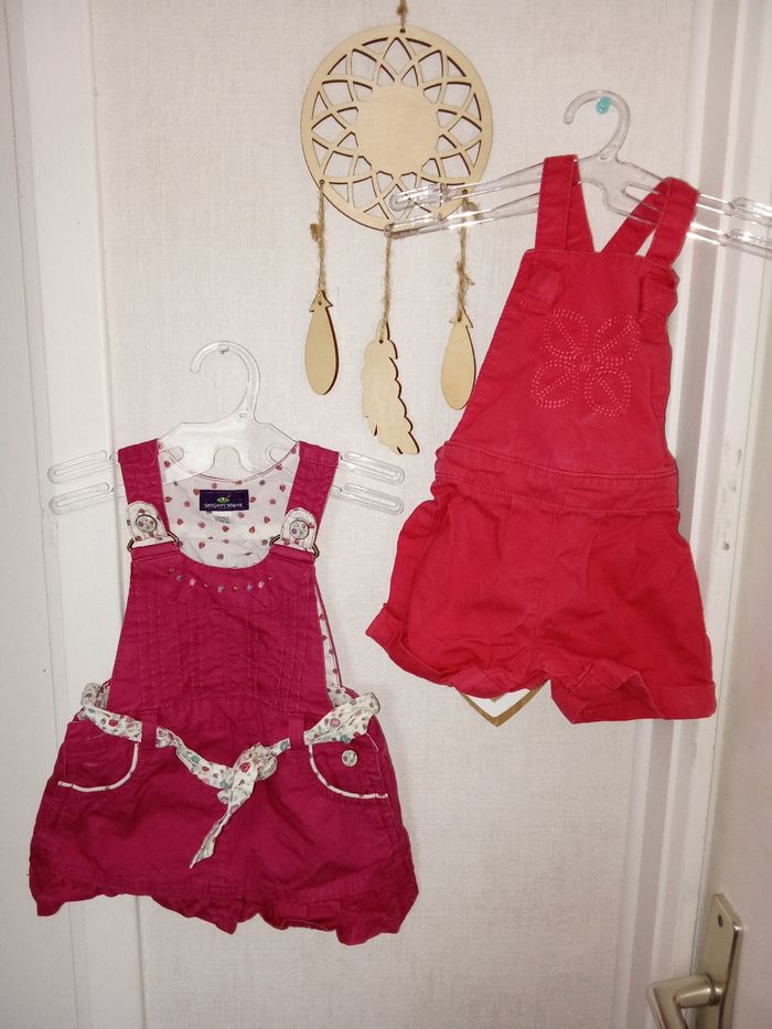 Lot de 2 articles en 3 mois pour bébé fille composé d'une robe salopette robe fushia sergent major et d'un short salopette rouge obaibi.