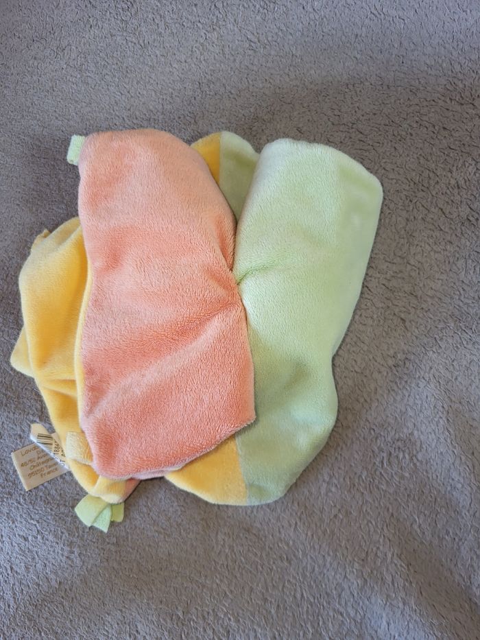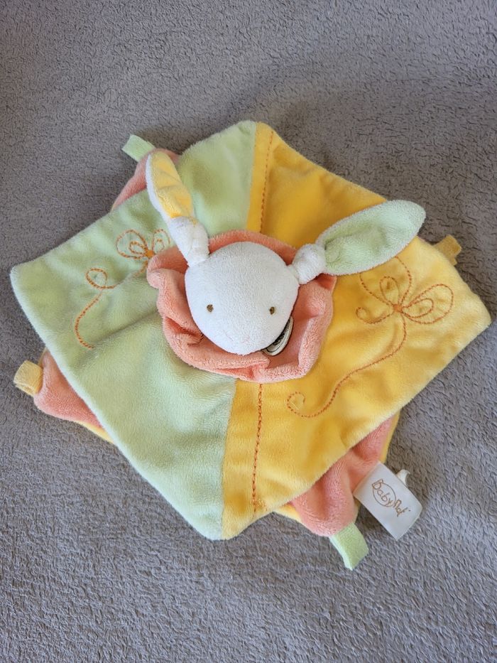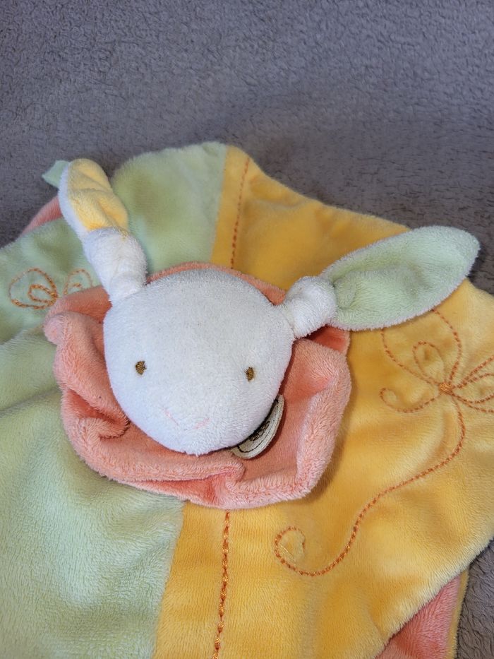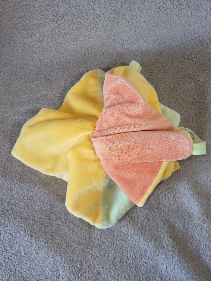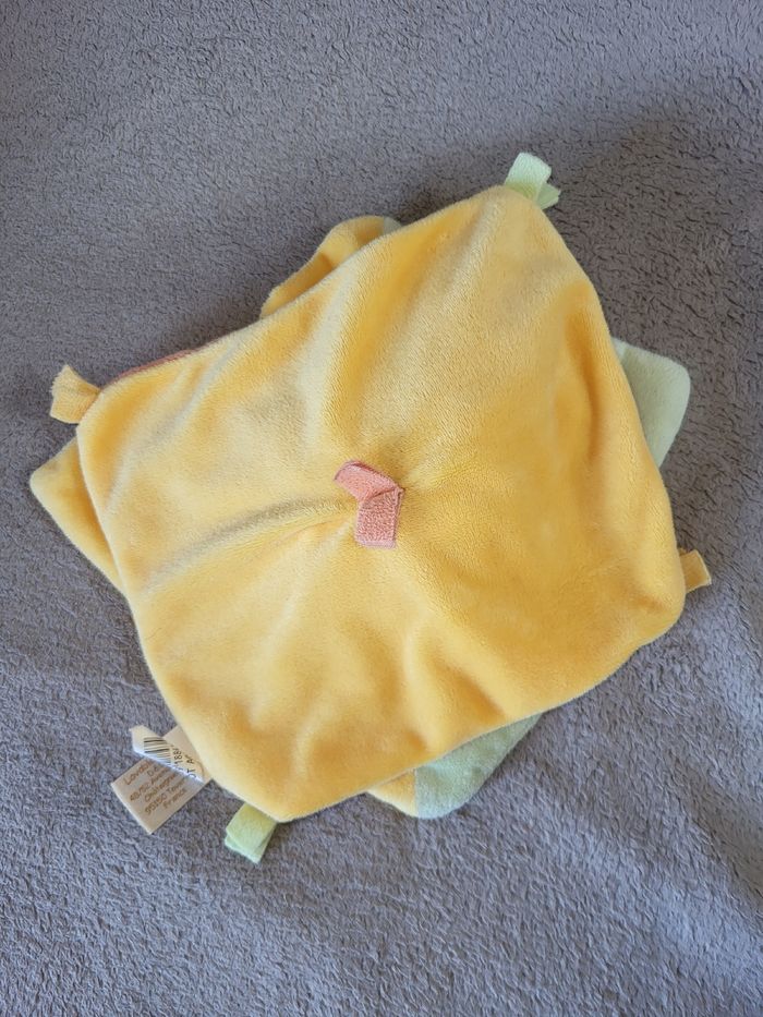 Doudou plat en velours tout doux lapin Baby Nat' Tons jaune, orange, vert Composé de 2 carrés cousus ensemble Dimension d'un carré environ 21cm Très bon état N'a pas été choisi comme LE doudou #virgy61joueteveil
