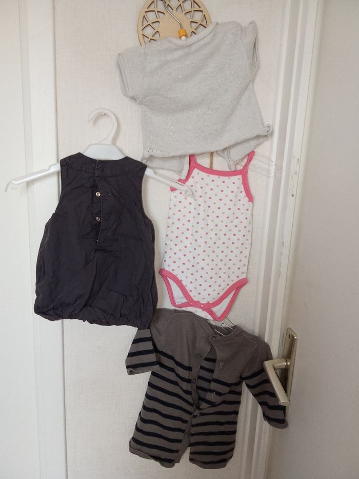 Lot mi saison, composé de 4 vêtements en 1 mois : 2 robes, un gilet brillant manche courte, 1 body et 1 débardeur. Marque kitchoun Bon état général. De nombreux autres lot fille mm taille également à vendre ds mon dressing et réduction activée