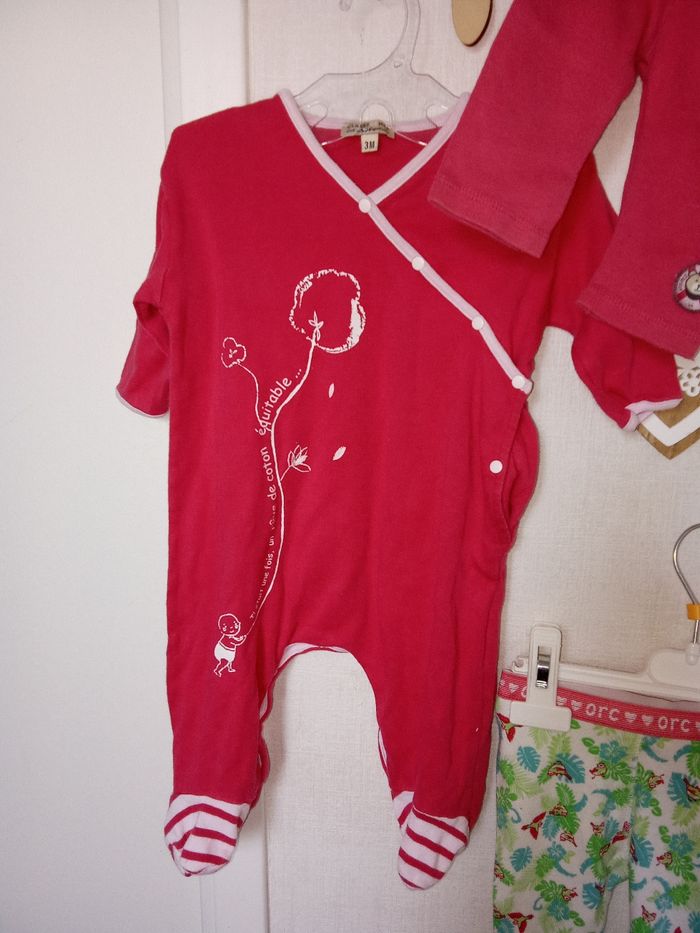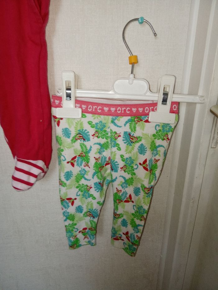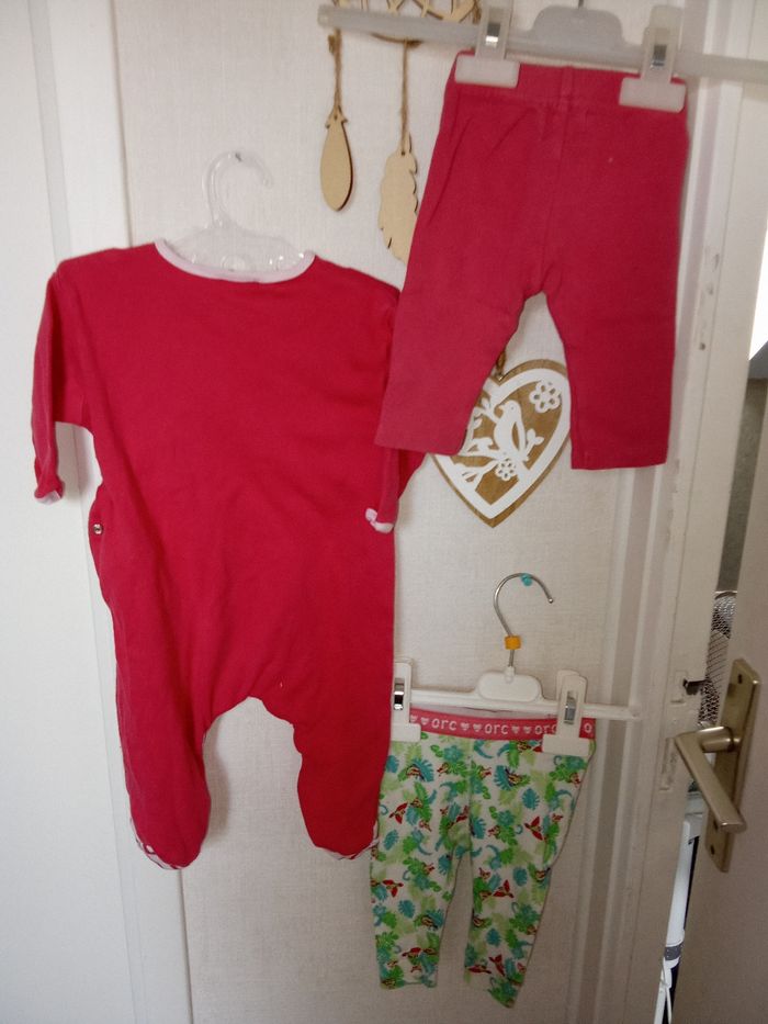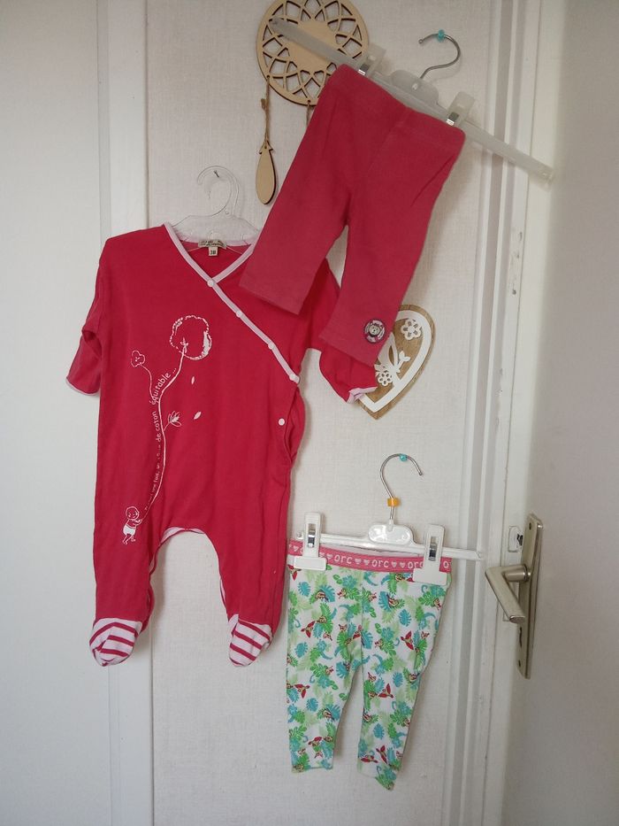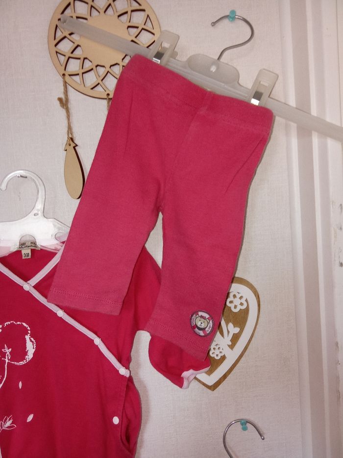 Lot en 3 mois mi saison comprenant un pyjama léger rose marque classe de mer , un legging fleuri orchestra et un autre plus épais rose sans marque .