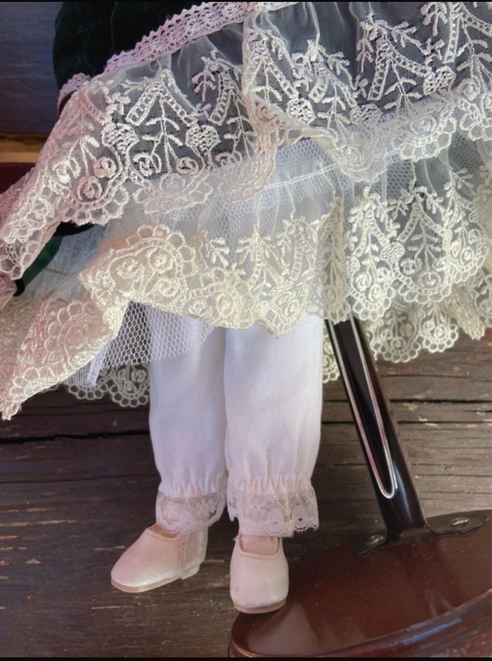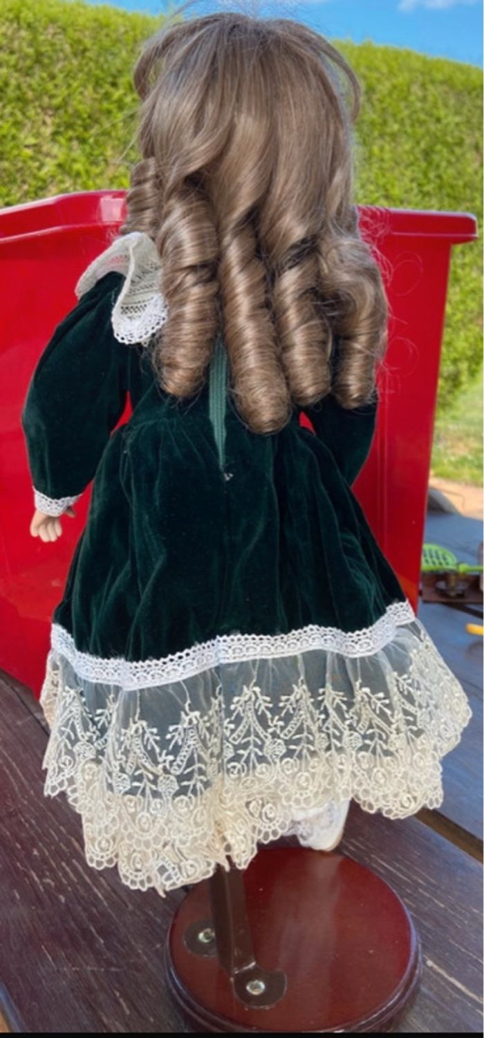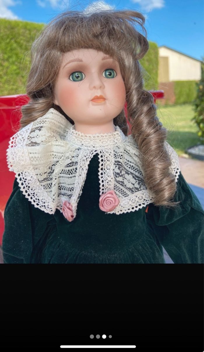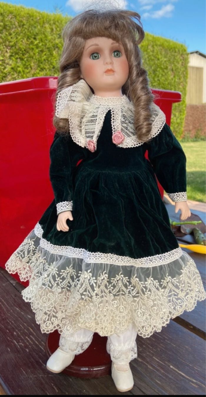 A vendre. Superbe poupée de collection en porcelaine. Elle est vendue avec son socle en bois. Taille: 46 cm (debout).