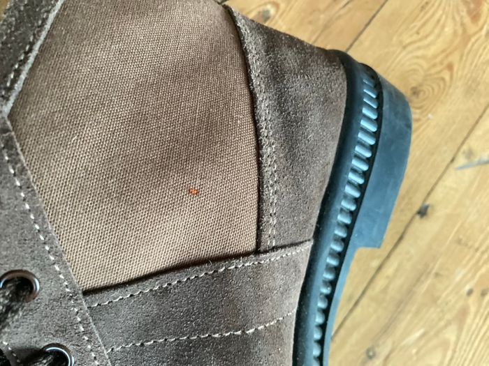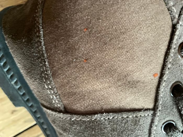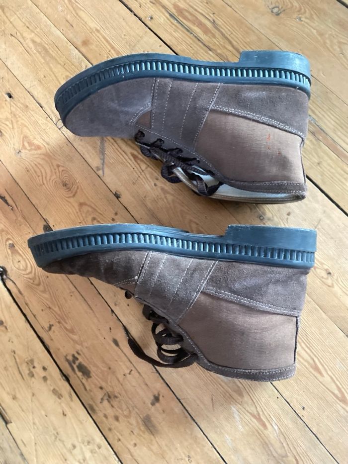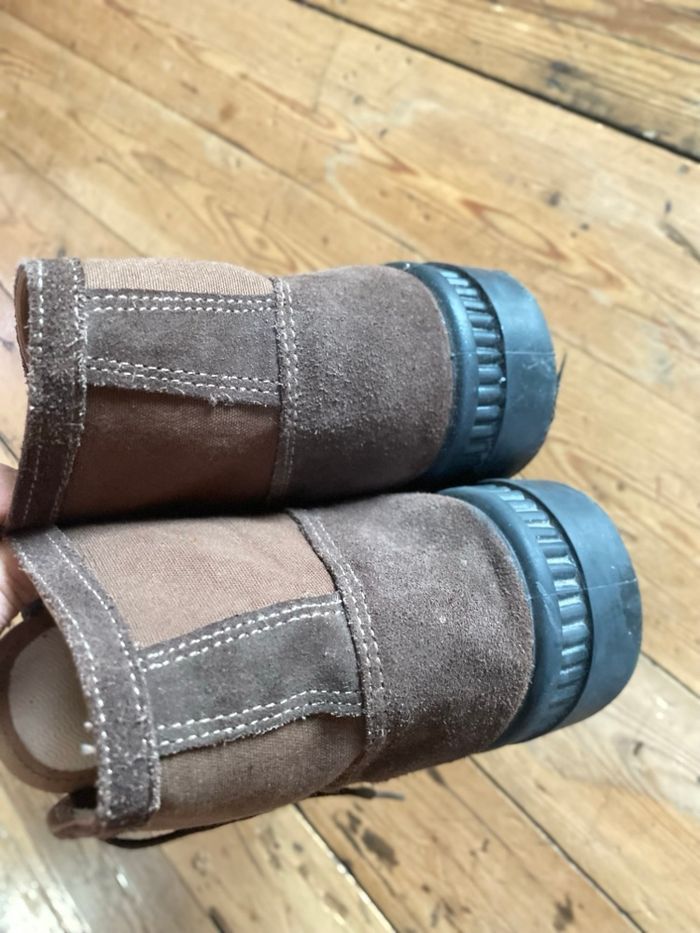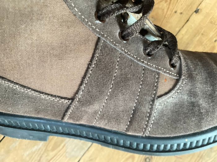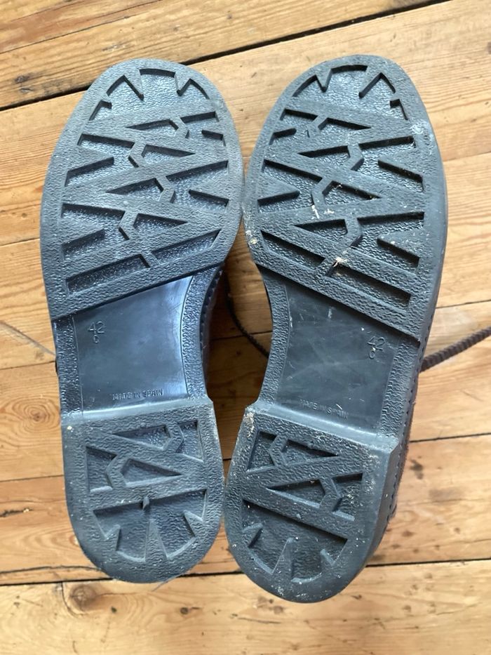 Chaussures en cuir et coton marron, très peu portées, elles sont en parfait état, cependant elles ont eues quelques éclaboussures de javel d'où les minuscules taches orange , je les ai toutes prises en photo, c'est très discret et la majorité seront cachées par le pantalon. Pointure 42 Lumen fabriquées en Espagne Description sur le site : Botte de travail rustique classique avec semelle intérieure en sparte et semelle extérieure en caoutchouc antidérapante. 100 % fabriquée en Espagne.
