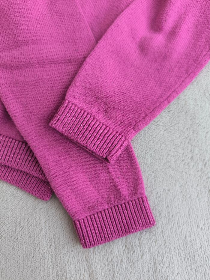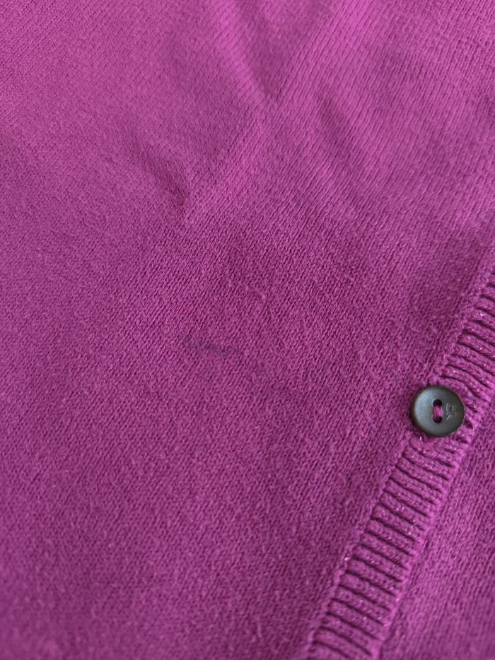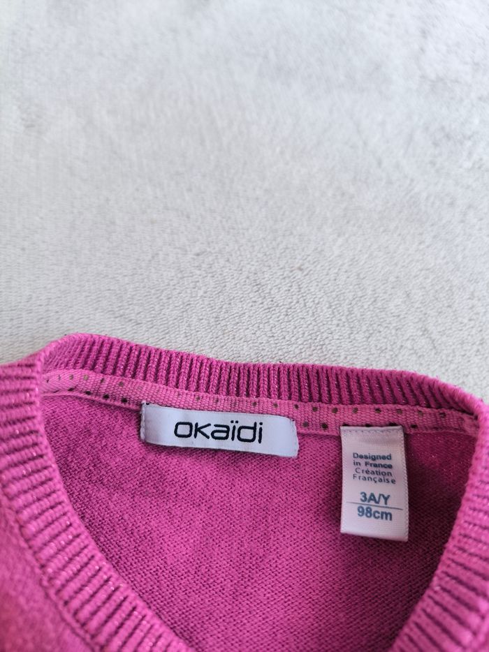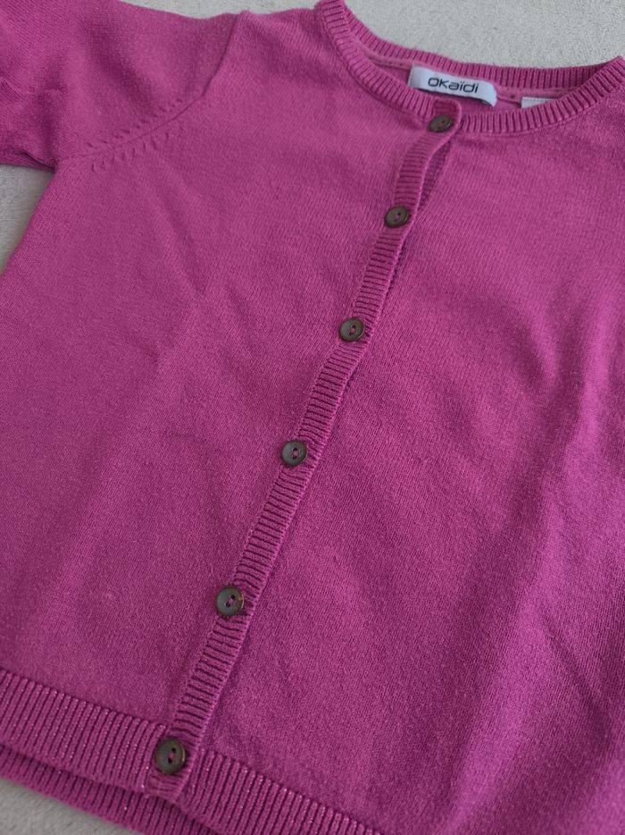 Gilet fin à manches longues Marque Okaïdi Taille 3 ans, 98 cm • Coloris rose, fils métalliques argentés • Fermeture par boutons • Coton fin • Bouloché, marque à l'avant En bon état #evelyne_filles_3ans #evelyne_filles