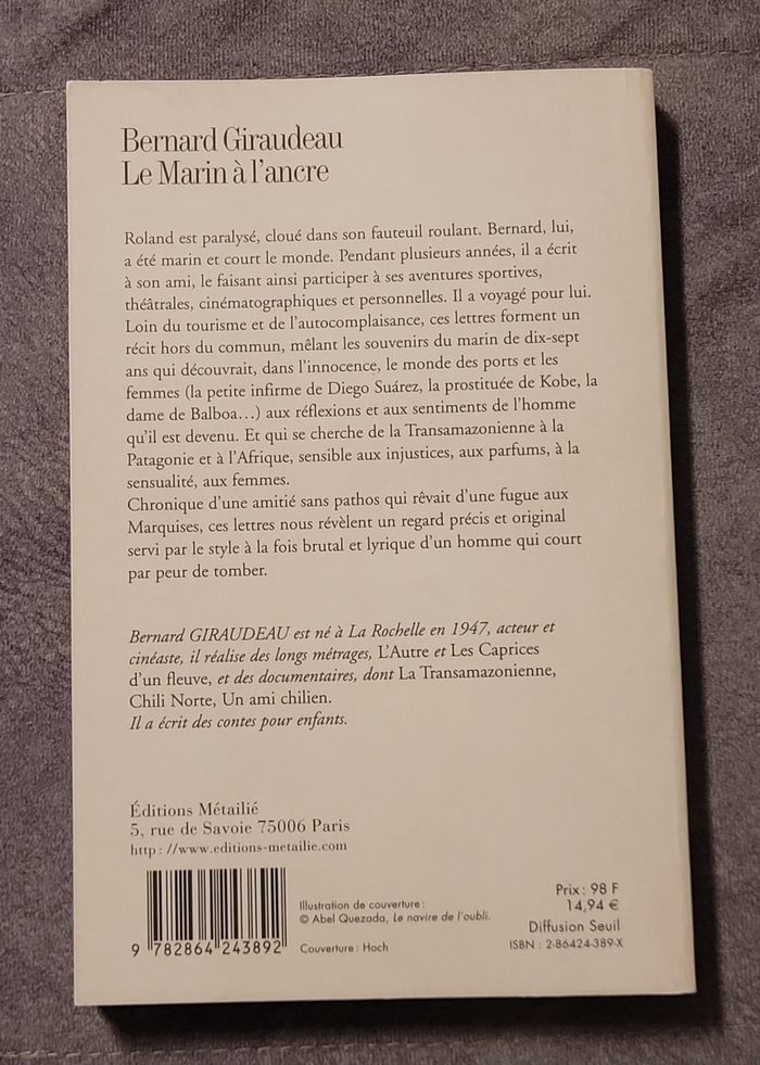 Bonjour, Je vends ce livre nommé - Le marin à l'ancre Bernard Giraudeau - en très bon état. Si vous rechercher un livre ou un acteur en particulier et pour gagner du temps, n'hésitez pas à me le demander, je vous répondrais dès que possible 😇 Veuillez vous abonner pour recevoir toutes les nouveautés Pour autres infos n'hésitez pas à me contacter. ***** Merci de votre visite *****