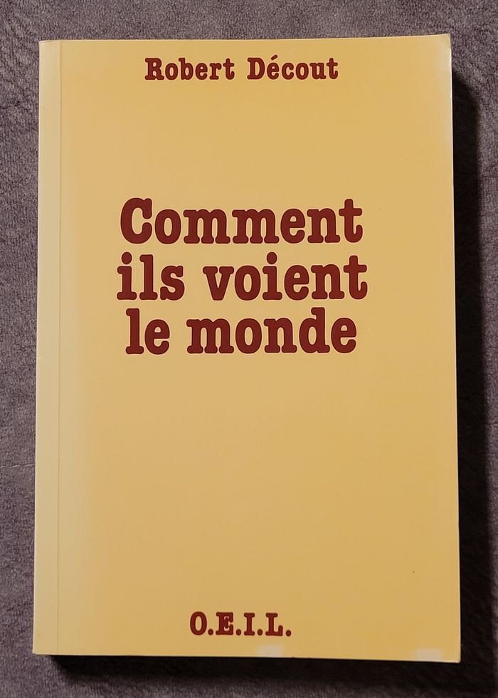 Bonjour, Je vends ce livre nommé - Comment ils voient le monde Robert Décout - en très bon état. Si vous rechercher un livre ou un acteur en particulier et pour gagner du temps, n'hésitez pas à me le demander, je vous répondrais dès que possible 😇 Veuillez vous abonner pour recevoir toutes les nouveautés Pour autres infos n'hésitez pas à me contacter. ***** Merci de votre visite *****