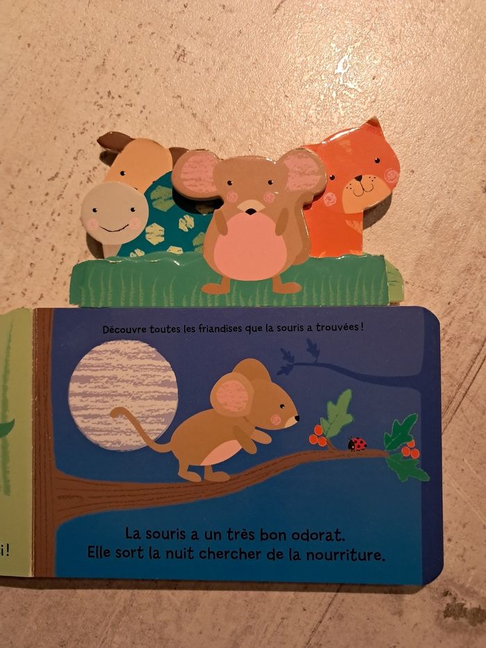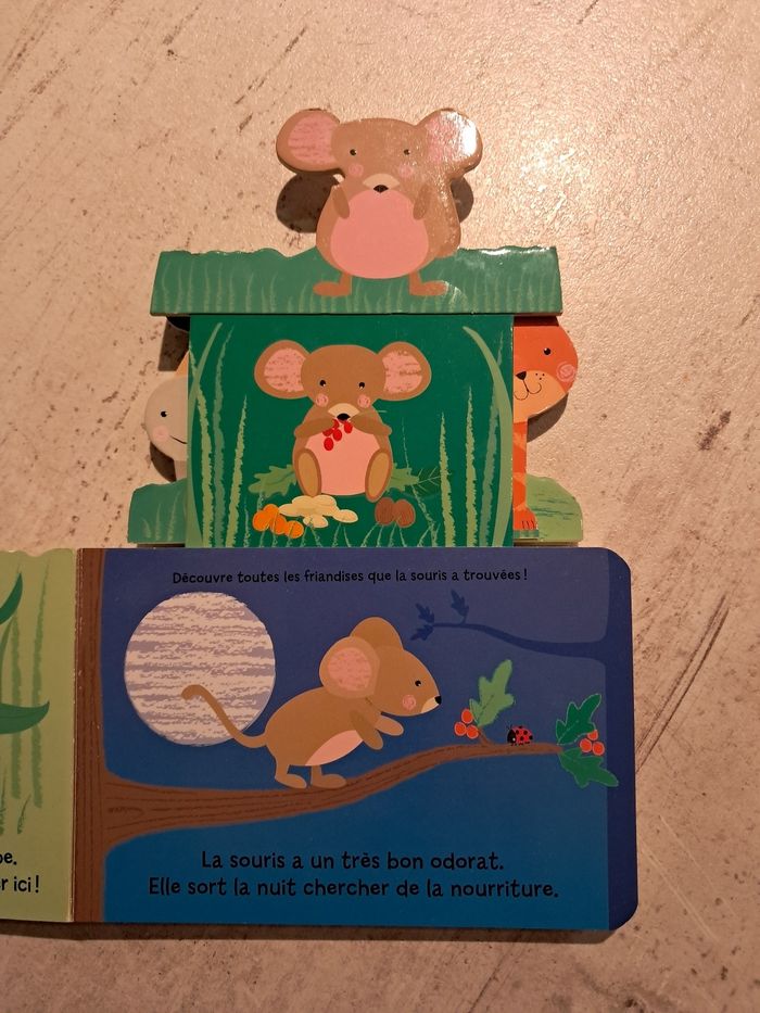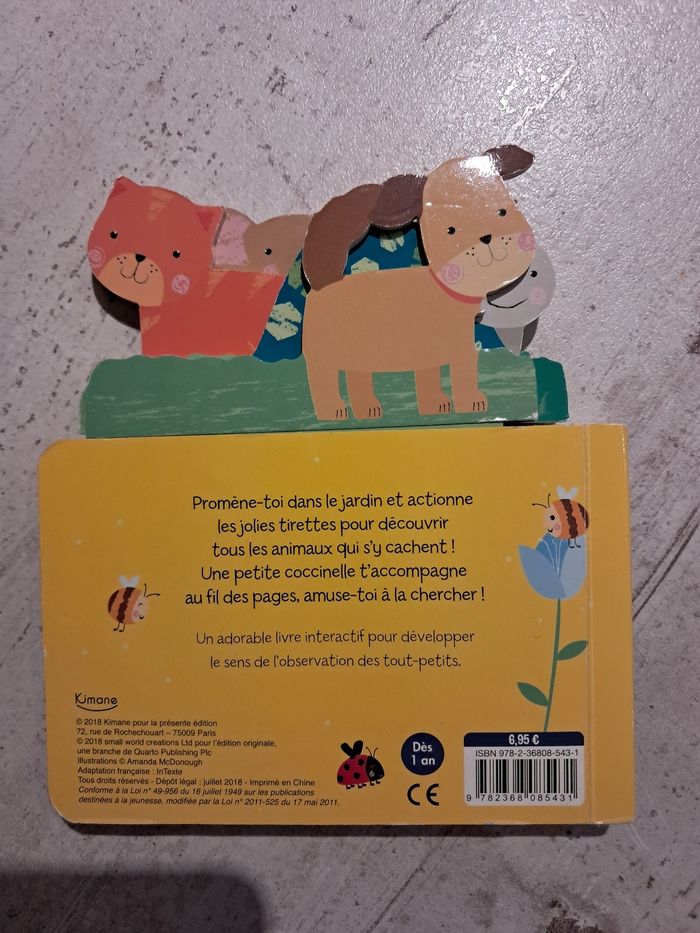 Descriptif : Promène-toi dans le jardin fleuri et actionne les jolies tirettes pour découvrir tous les animaux qui s'y cachent ! Une petite coccinelle t'accompagne au fil des pages, amuse-toi à la chercher ! Un adorable livre interactif pour développer le sens de l'observation des tout-petits. Bon état