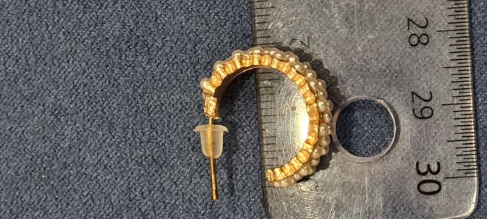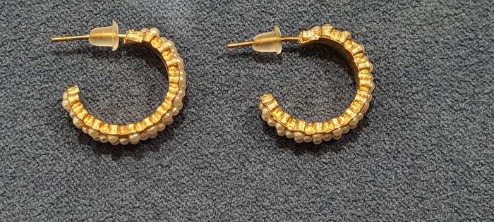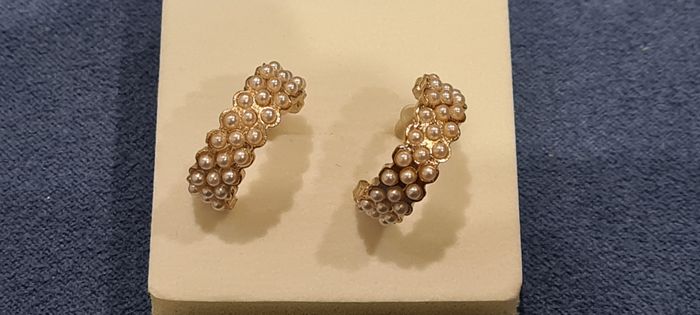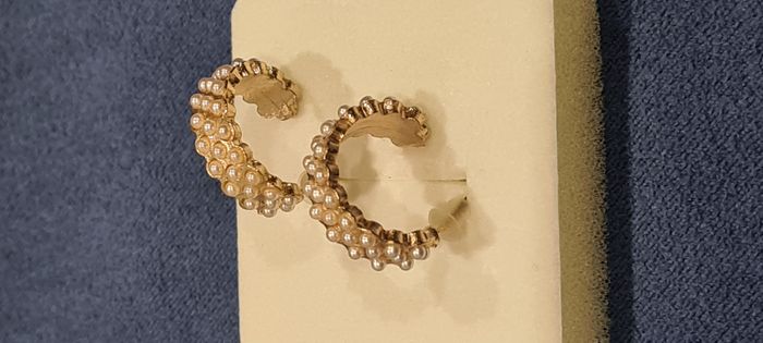 Demi créoles dorées avec 37 petites perles nacrées incrustés. Elles sont disposées en rang de 1, puis un rang de 2 et ainsi de suite. Tige acier, poussoirs silicone Diamètre 2 cm, épaisseur 0.8 cm. Très bon état Autre paire quasi identique dans mon dressing. #créoles #demicréoles #perlesnacréess #demicréolesdorées #bouclesdoreilles #bijouxfantaisie #mar-taybijoux