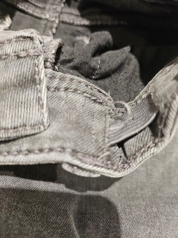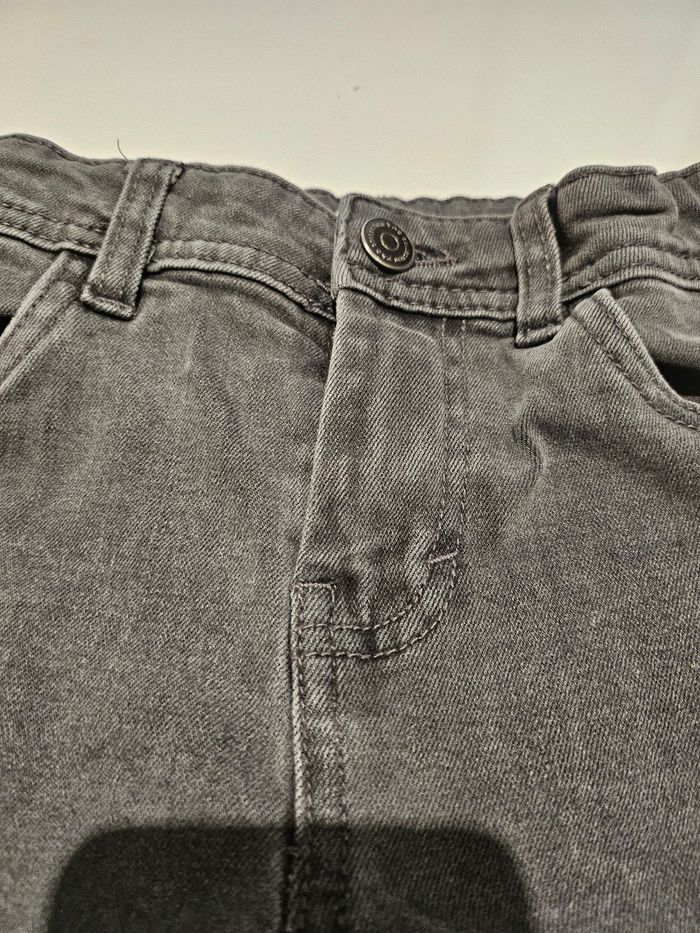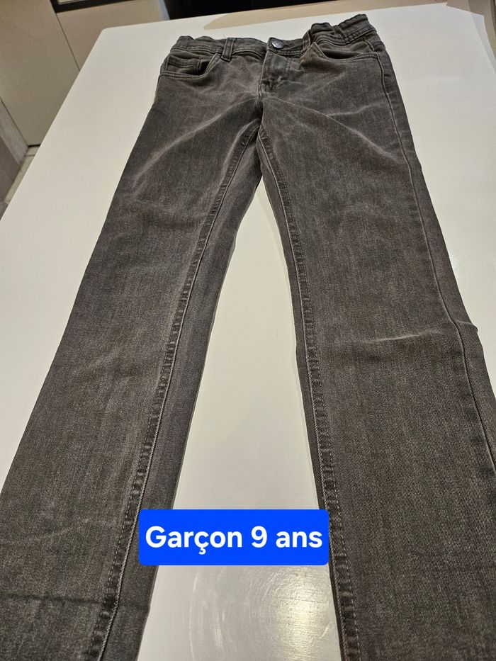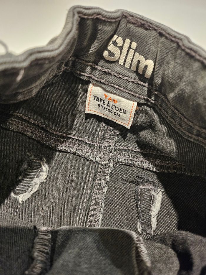 Jean slim gris. Poches devant et derrière. Se ferme avec bouton et fermeture. Taille réglable. Marque : Tape à l'oeil (TAO) Taille : 9 ans