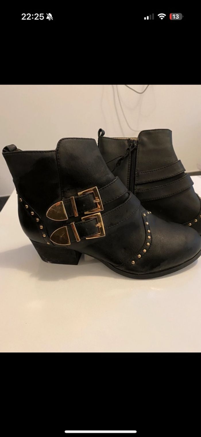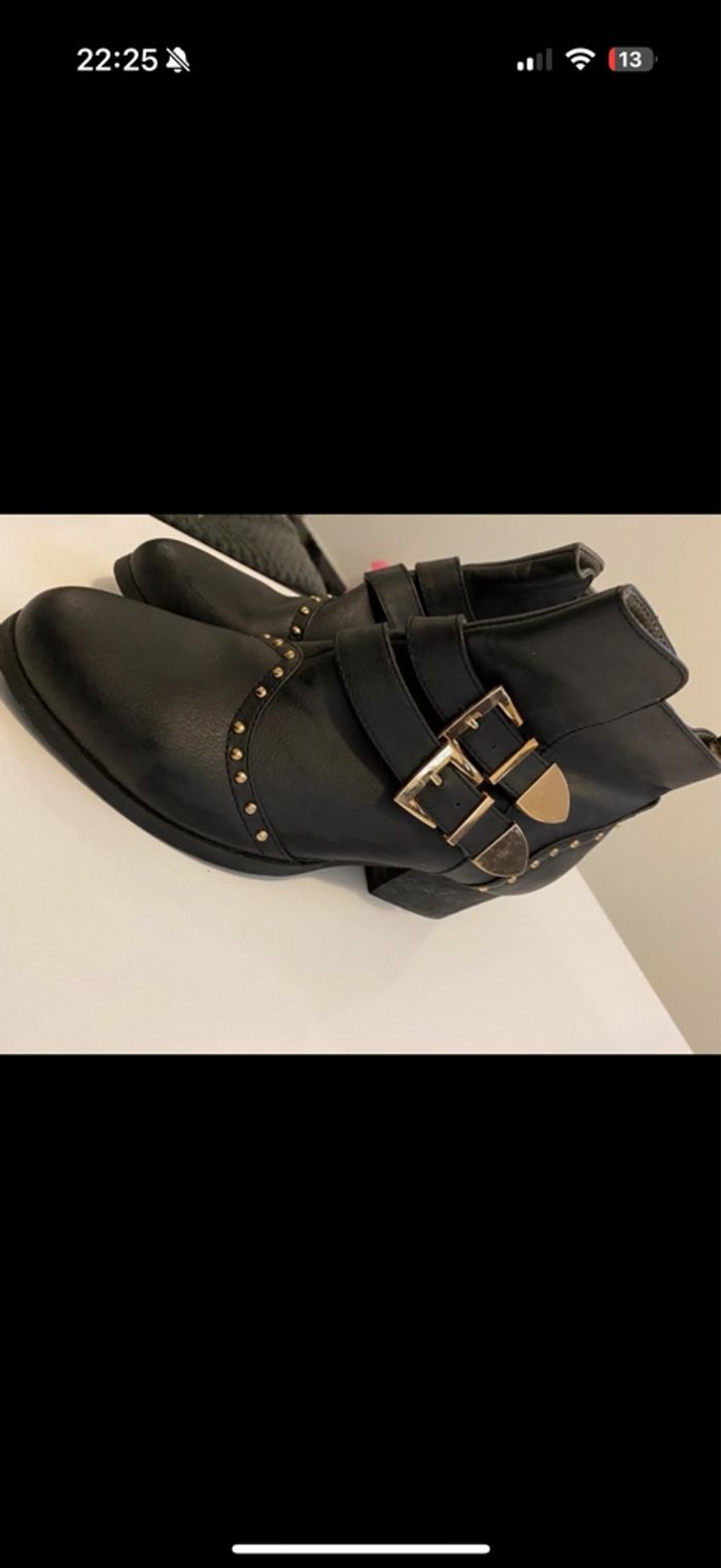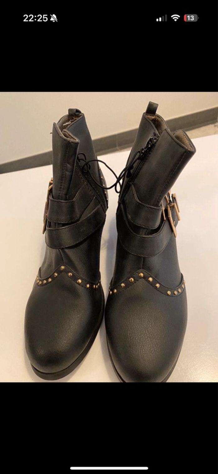 👢 Superbes bottines noires , élégantes et modernes ! Un modèle chic et confortable, parfait pour les soirées, les fêtes ou un look stylé au quotidien. 🏷️Marque : Camaïeu 📐Pointure : 37 🎨Couleur : Noir avec détail doré 🏷️État : Neuf 👢 2 sangles , fermeture zippé sur le côté 💶 Prix de base : 39.95€ voir photo