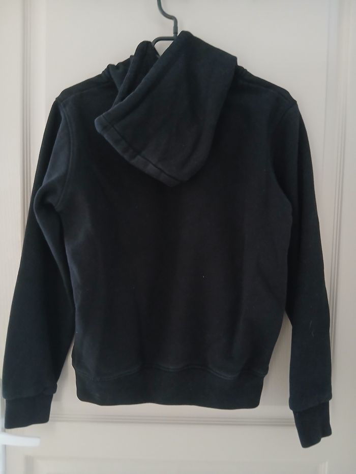 Sweat noir à capuche, en coton et polyester. 40 cm de largeur des épaules 48 cm de largeur des aisselles 59 cm de longueur