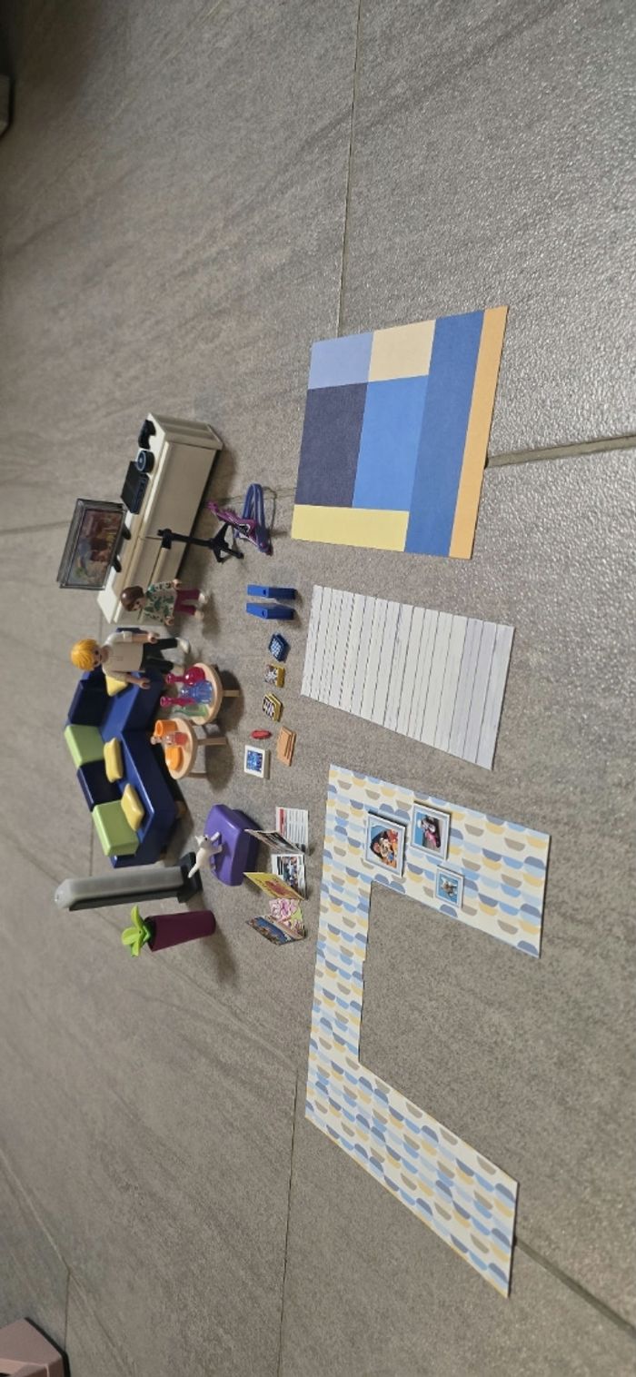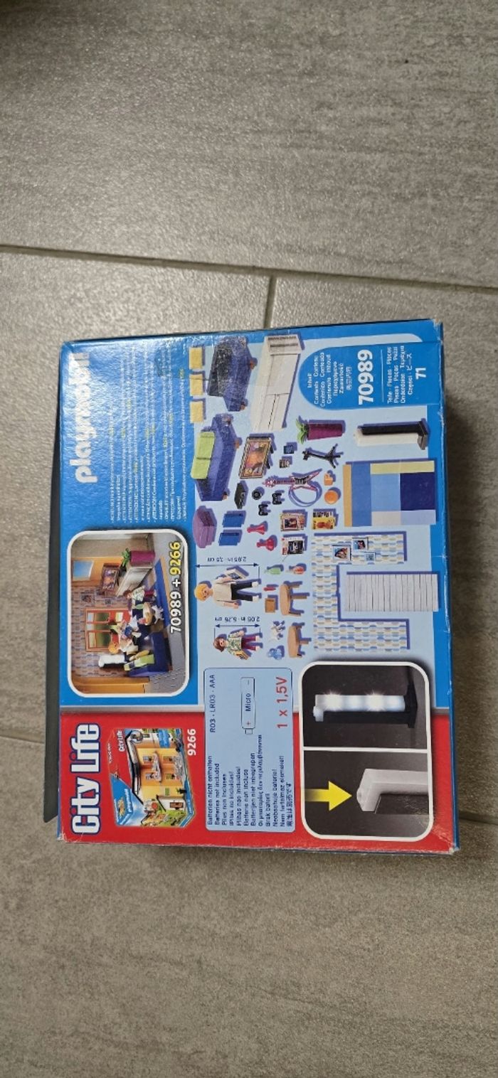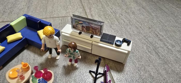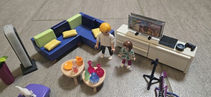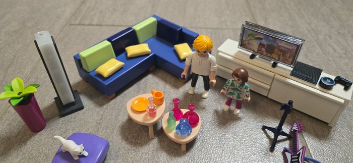 Playmobil salon aménagée avec une colonne lumineuse fonctionnelle. Neuf, juste exposé (reçu avec une petite manette manquante).