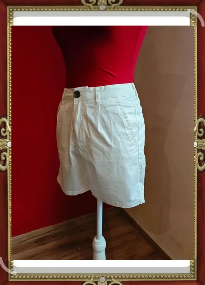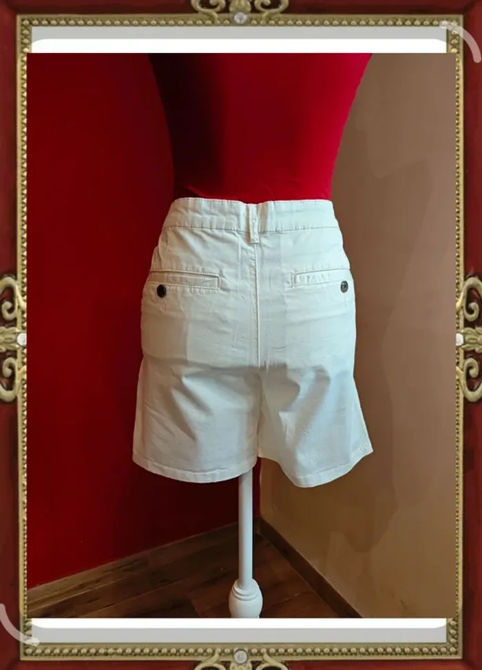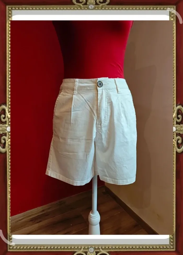 Short en coton blanc avec pinces. Il a des poches. Taille S ample, correspond à une taille L. VOIR Dimensions approximatives : Tour de taille de côté à côté 38 cm Entrejambe devant 26 cm Longueur 38,5 cm