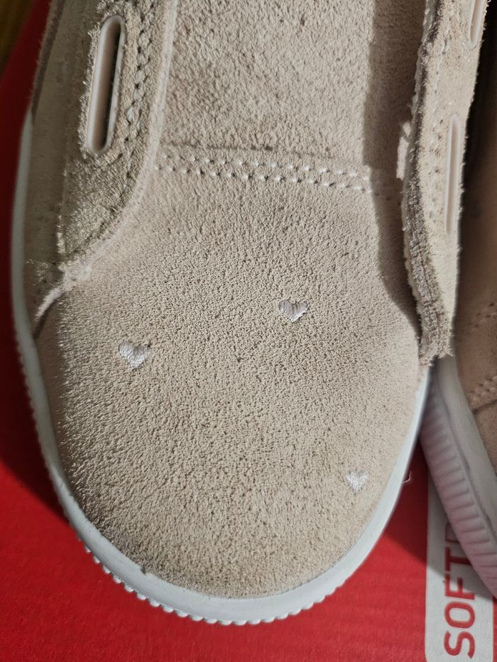 Elles sont en tres bon etat général meme si les photos ne révèlent pas vraiment la réalité et la couleur de la basket. Elles sont vieux rose en nubuck avec une languette cœur et des petits cœurs brodés partout