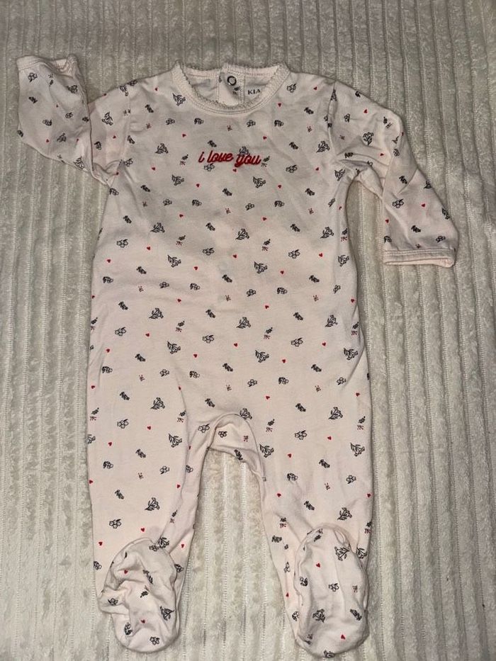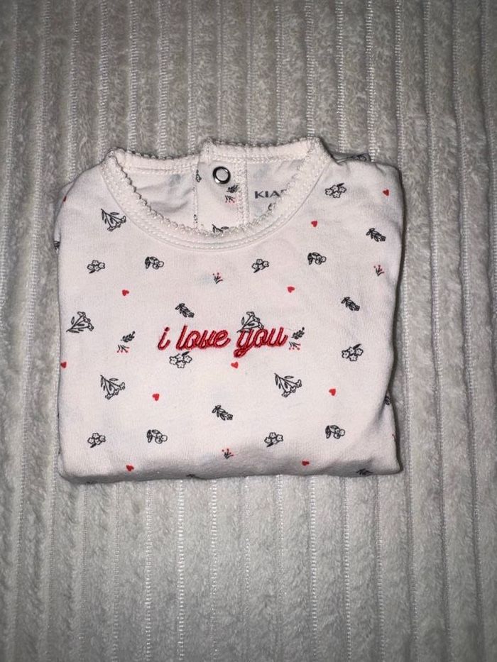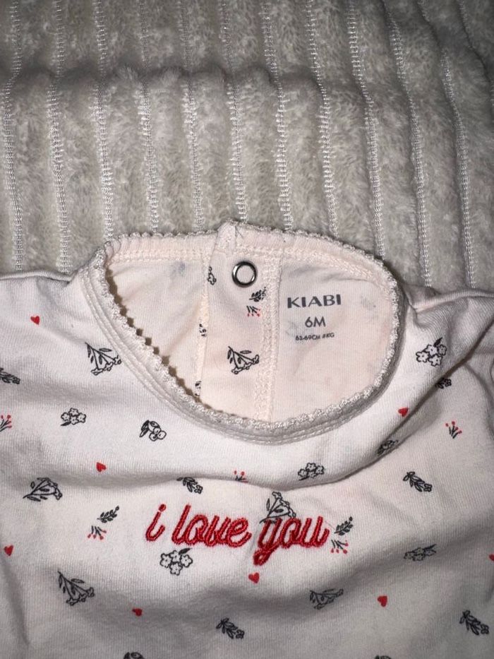 Pyjama coton, de couleur beige et fleuries, avec écriture rose «  I Love You », avec des boutons à pression à l’arrière, pyjama de chez KIABI, taille 6 mois en excellent état/ comme neuf. Porté x2, nettoyé et repassé. En excellent état : aucun défaut, boutons-pression impeccables ✅ Détails : ▪️ Marque : KIABI ▪️ Taille : 6 mois ▪️ Couleurs : beige ▪️ État : en excellent état/comme neuf 🏠 Maison non fumeur 📦 Envoi rapide et soigné ✨ N’hésite pas à jeter un œil à mes autres articles bébé — lot possible !