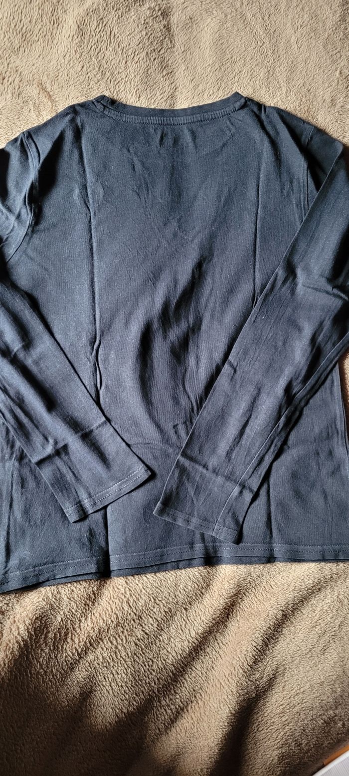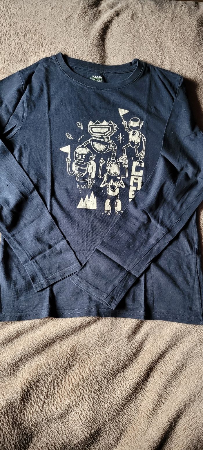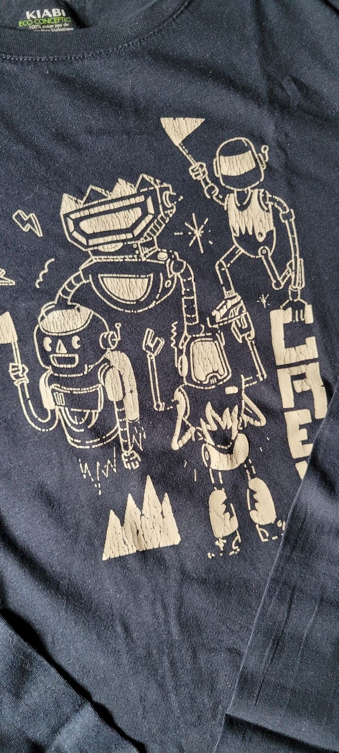 Maillot manches longues Bleu marine 12 ans Kiabi Dessin craquelé légèrement voir photo Petit trou sur la manche voir photo Bon état