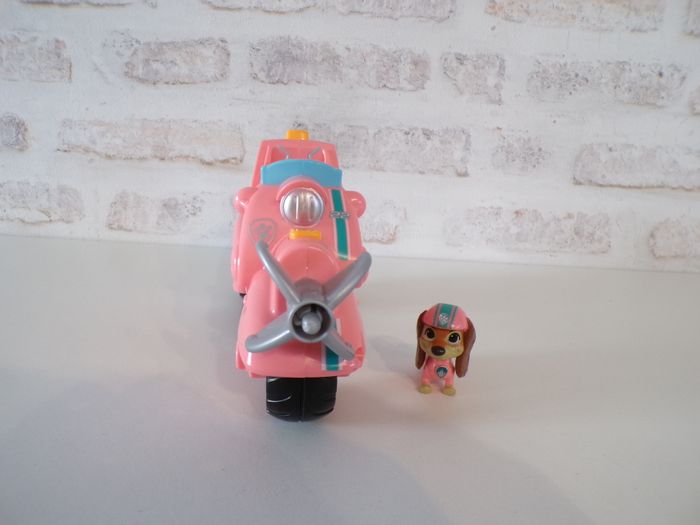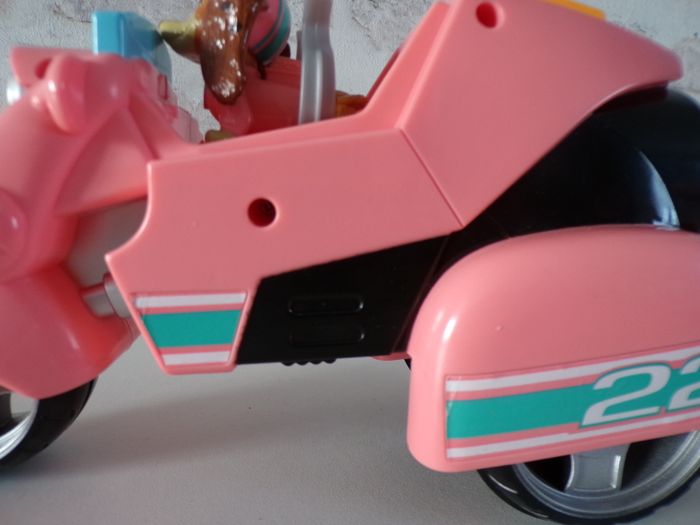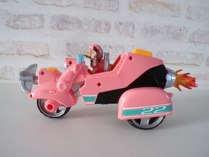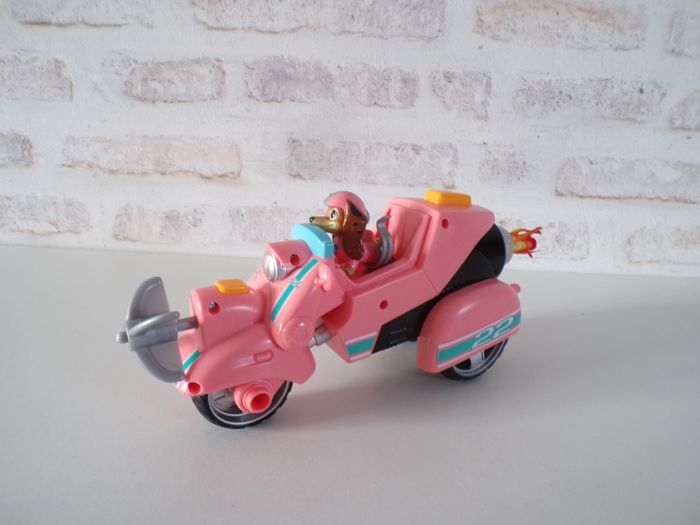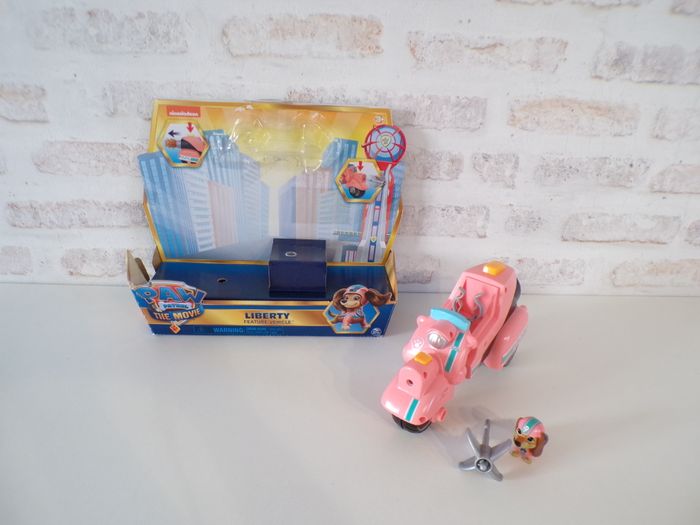 Moto Liberty - Paw Patrol - Pat Patrouille e, très bon état avec son emballage d'origine. Seuls deux coins d'autocollants furent recollés proprement (cf photo). Le grappin et la flamme arrière fonctionnent parfaitement.