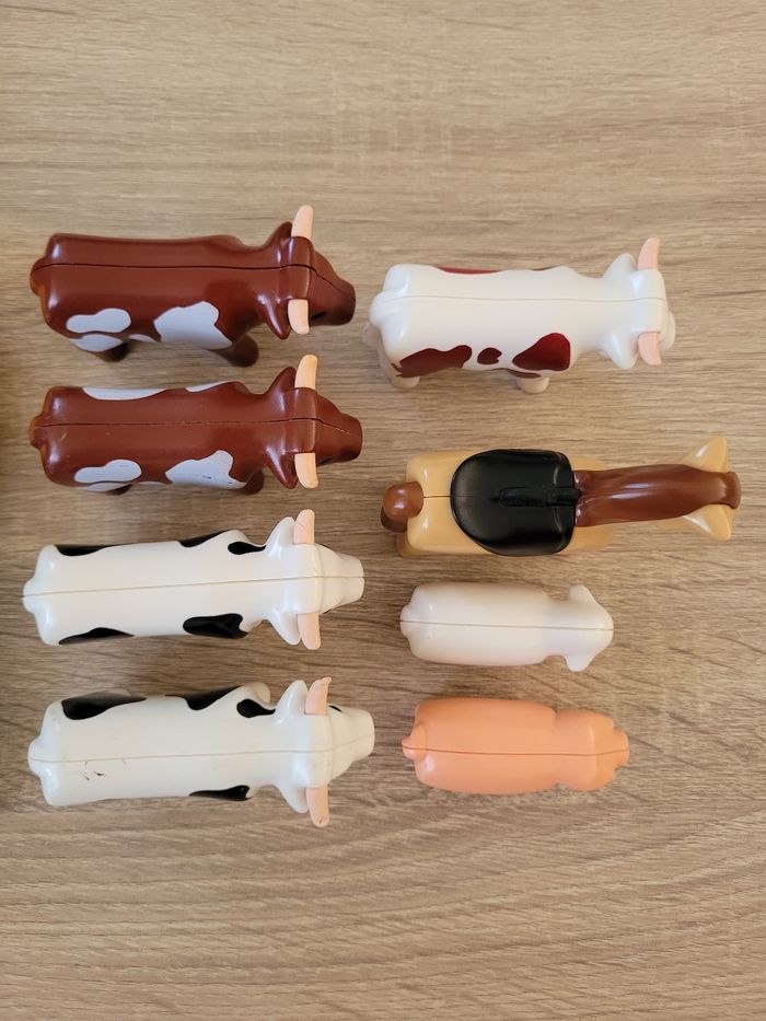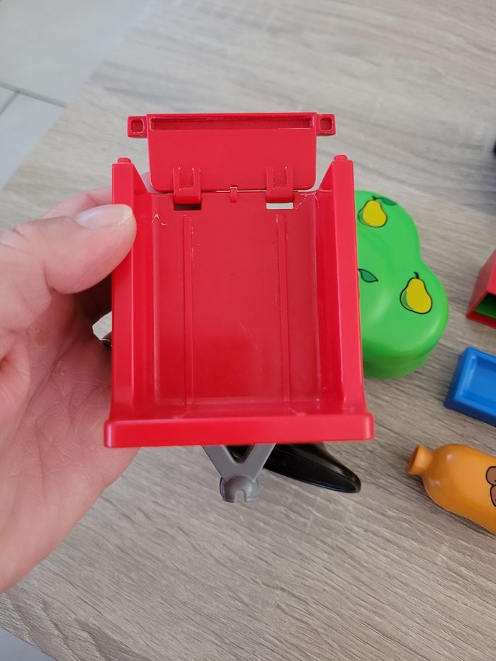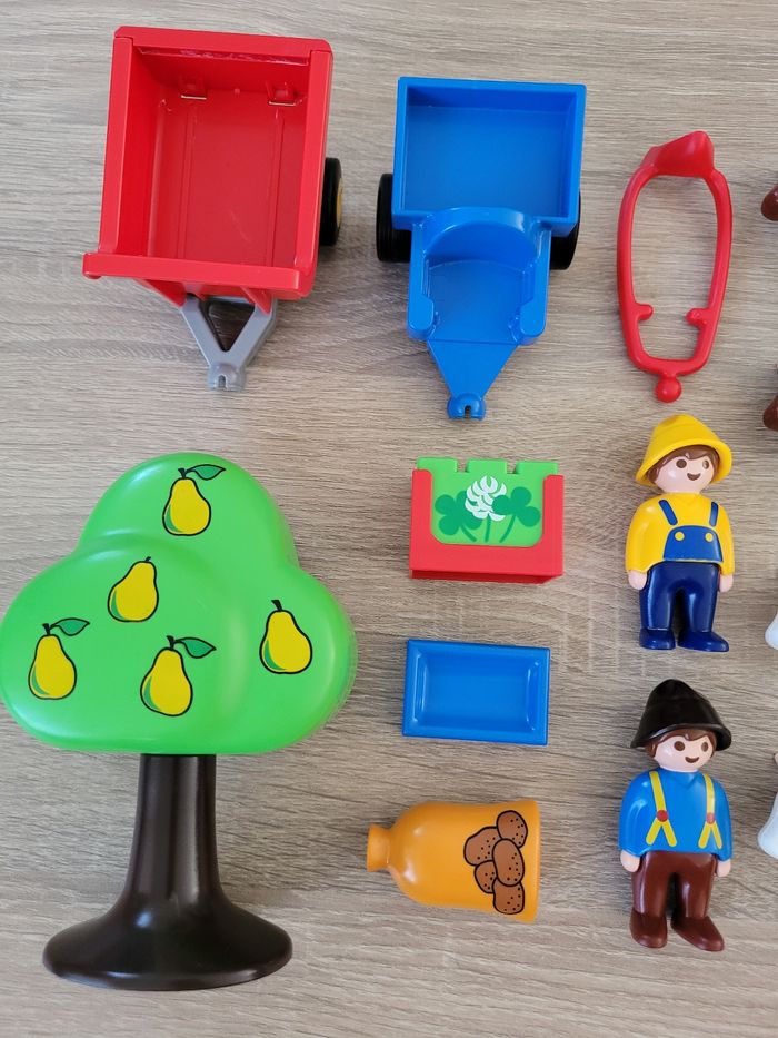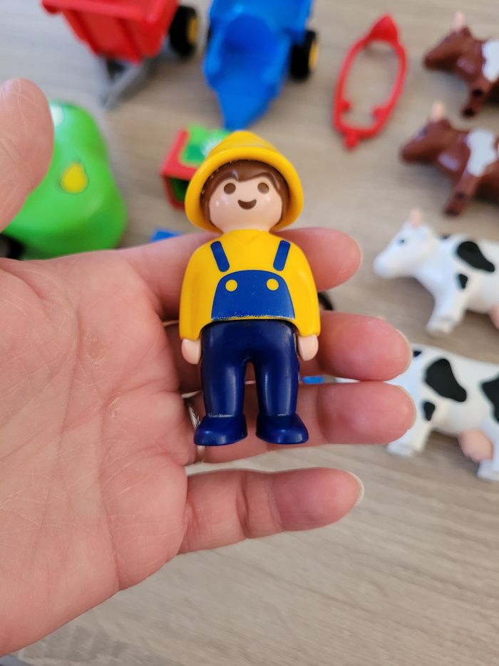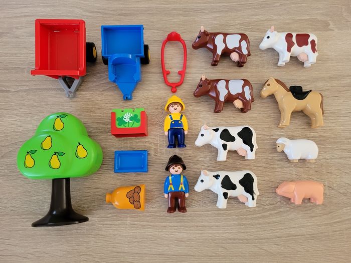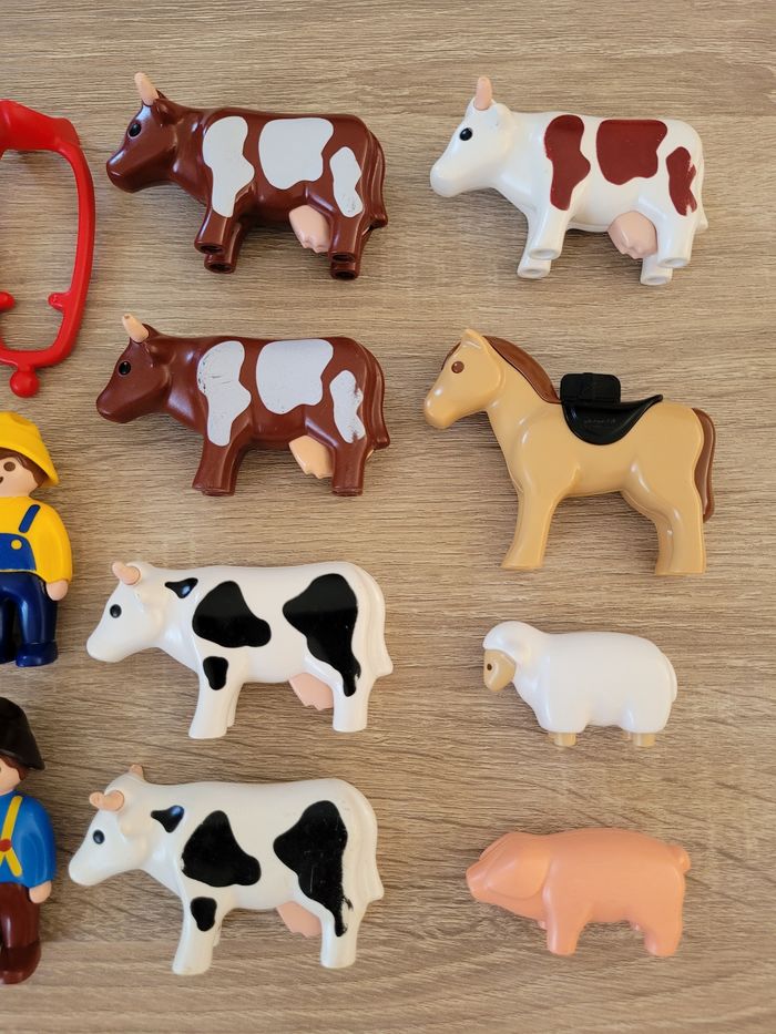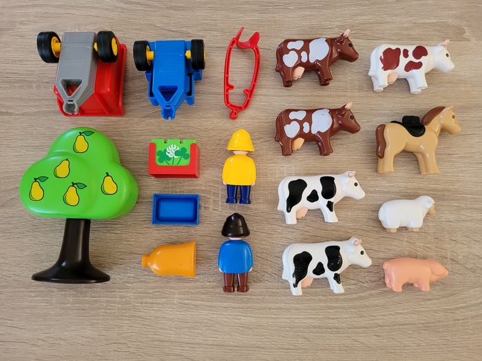Vend lot Playmobils 1 2 3 Premiers âges thème de la ferme comprenant des animaux (5 vaches, 1 cheval, 1 mouton et 1 cochon), 2 personnages, un arbre, un bloc de fleurs, un sac, un bac et 2 charettes. Lot en bon état juste des signes d'usures liés au jeu (voir photos). À partir de 18 mois. Vendu tel que sur la publication.