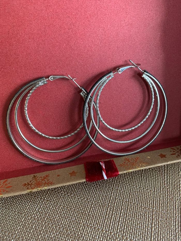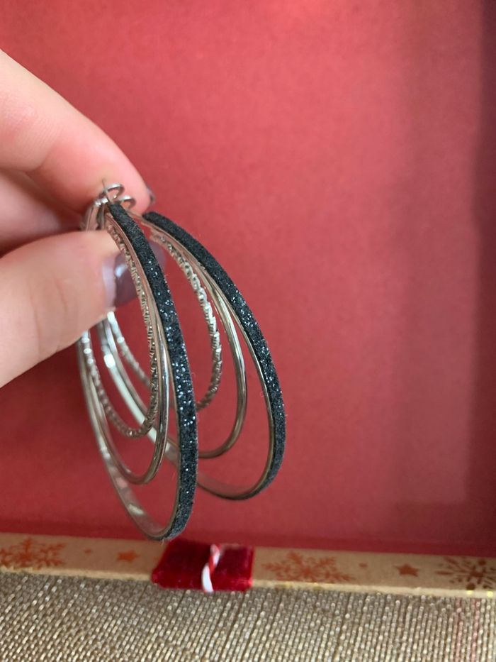 Boucles d’oreilles anneaux Argentés et noires pailletées Envoi rapide et soigné.