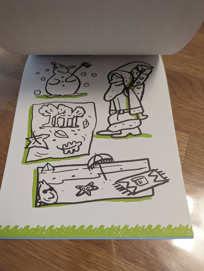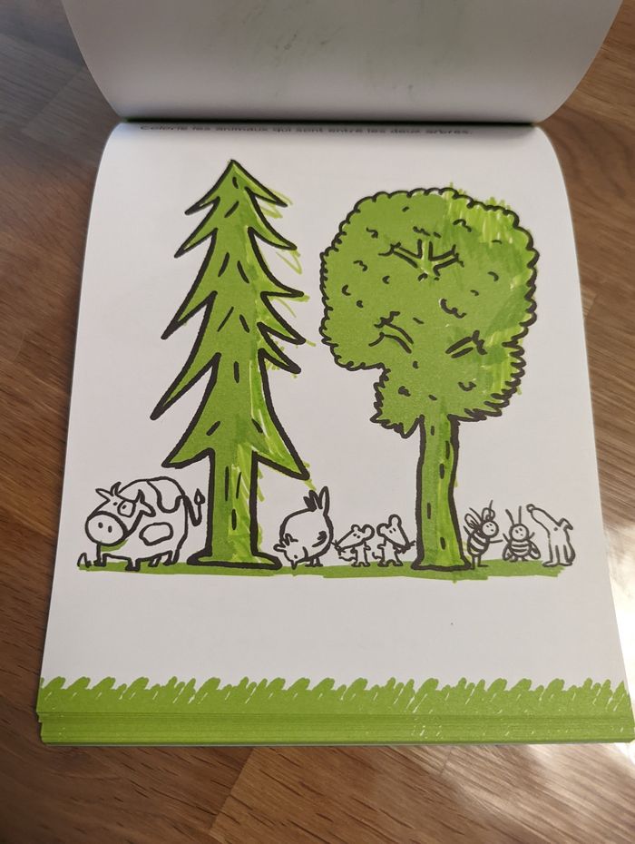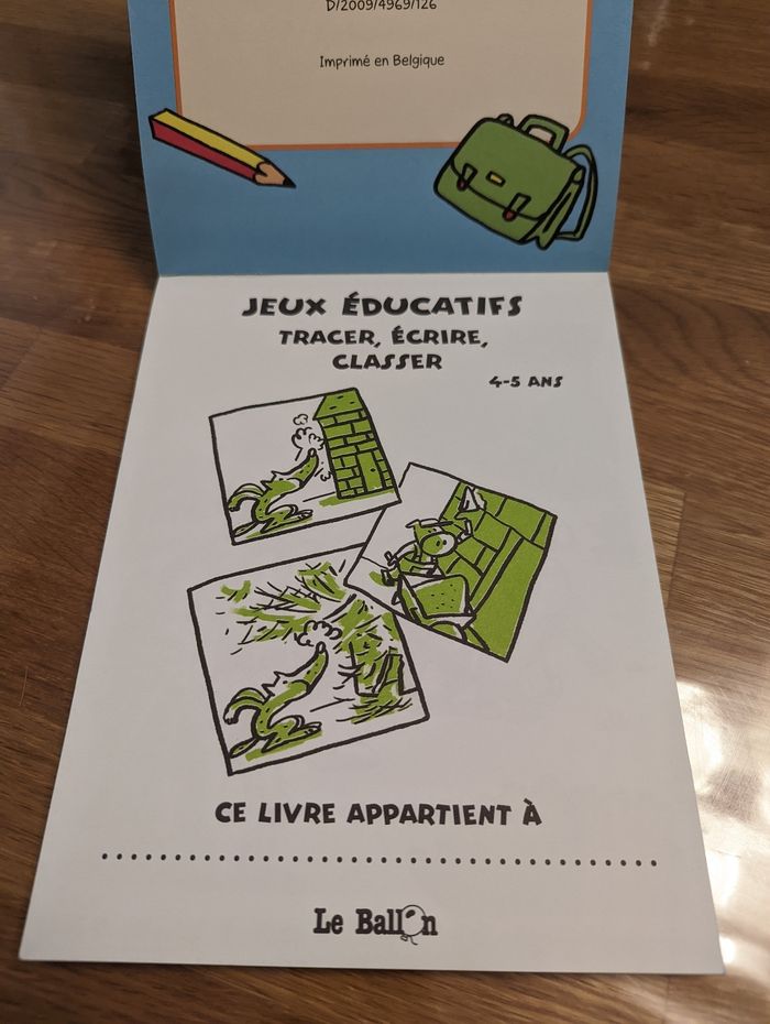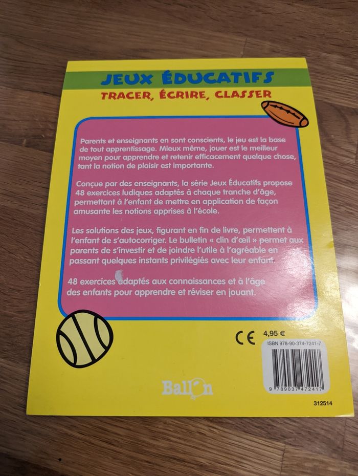 Livre de jeux éducatifs 4-5 ans, très bon état, environ 48 pages d'activités dont 5 ont déjà été faites. Le reste en parfait état, toutes les pages sont différentes et contiennent du vert. Traces possibles sur la couverture.