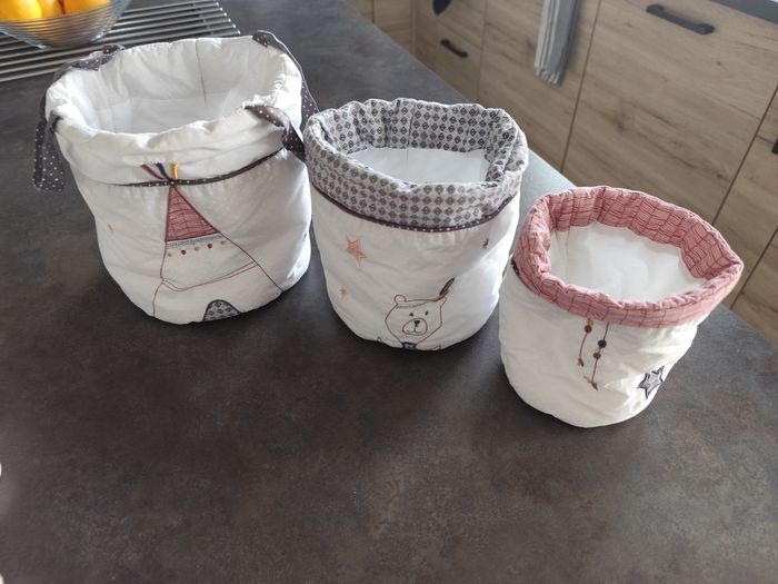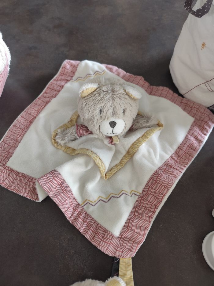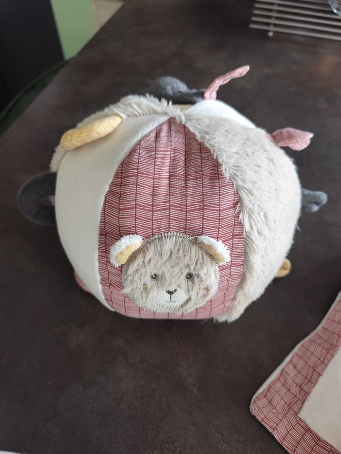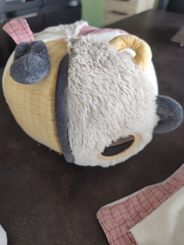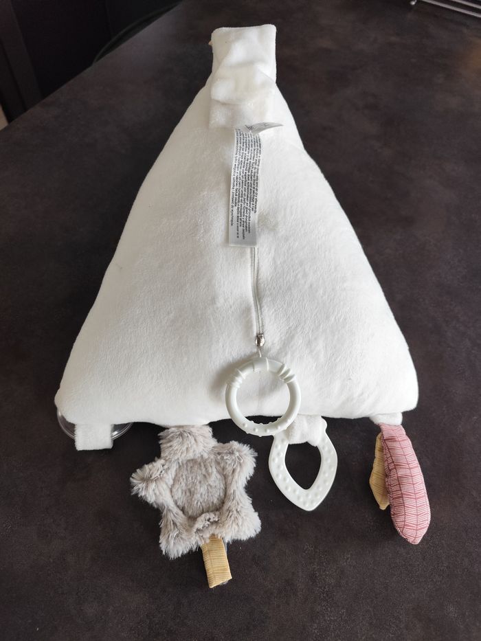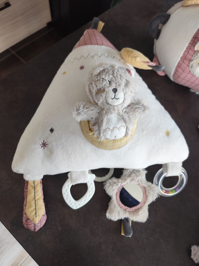 1 grande pyramide d'activité Timouki musique mécanique ( les leds ne fonctionnent plus) 1 triangle d'activité 1 doudou 1 hochet 1 balle d'activité 3 panières en tissus