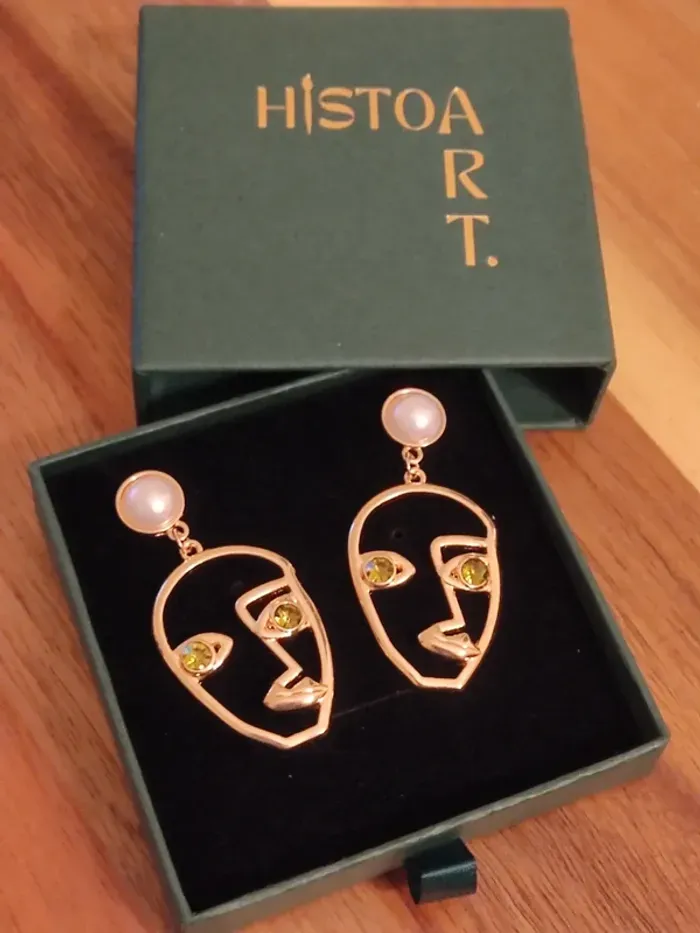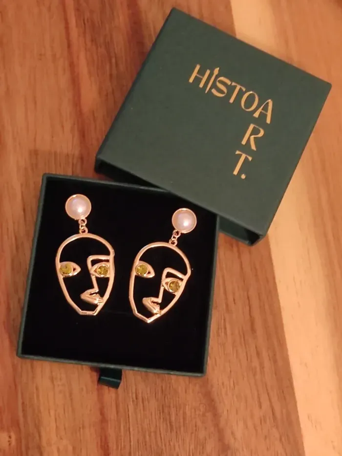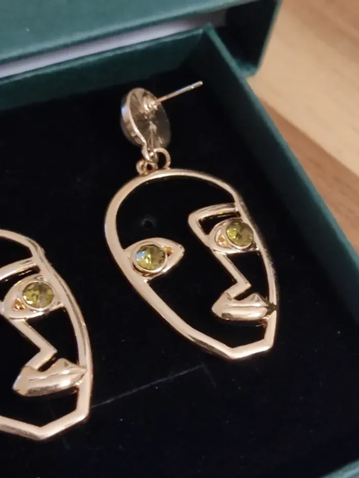 Paire de boucles d'oreilles dorées inspirées du style abstrait d'un visage et de yeux verts !
