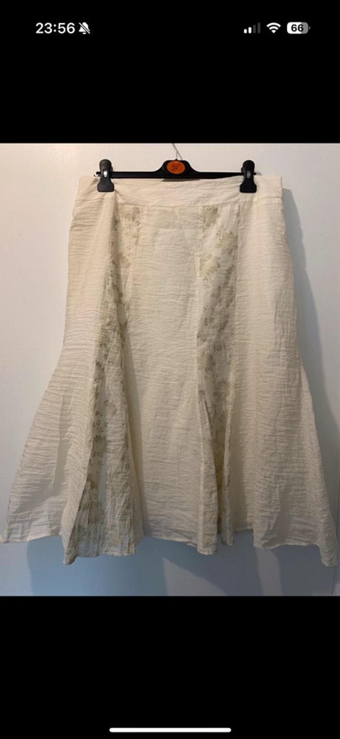 🩷 Très belle jupe longue en tissu léger, parfaite pour le printemps ou l’été. Une pièce féminine, élégante et facile à assortir ! 🎨 Couleur : beige clair, avec de jolis empiècements à motifs floraux 👗 Coupe : évasée et fluide 📏 Taille : 46 🔒 Fermeture sur le côté 📐 Dimension: 45 cm à la taille,hauteur : 80 cm 🧵Matières : 70% coton + 30% polyamide nylon 🌼 En très bon état