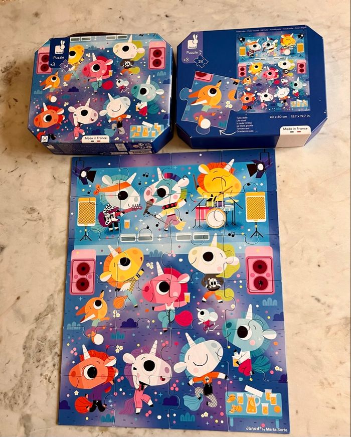 Marque : Janod Nombre de pièces : 24 Dimensions : 50 cm x 40 cm Matériaux : carton épais, Âge recommandé : dès 3 ans Thème : licorne Conditionnement : boîte rigide avec poignée facile à transporter Favorise : développement de la logique, coordination œil-main, concentration