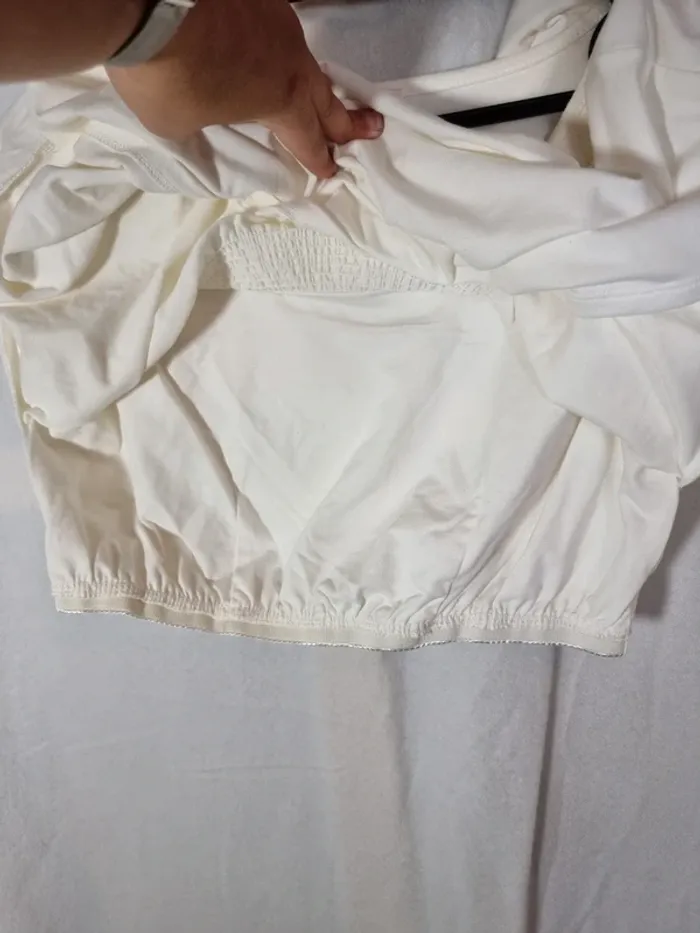 Blouse manches courtes femme couleurs et prix crème taille 42. Avec brassière intégrée (voir photo). En très bon état. Envoi rapide. Négociable.