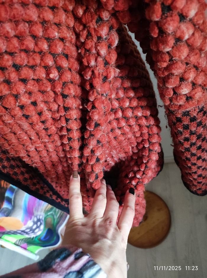 Gilet Hiver chaud noir et rouille. - Col V fermeture par zip et bouton coupe cache coeur - manches longues resserrées sur l'avant bras - coupe ample et confortable - État d'usage - Longueur sous les fesses