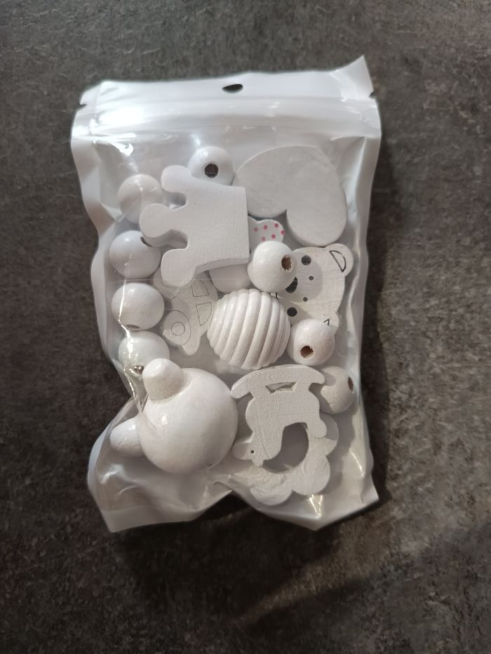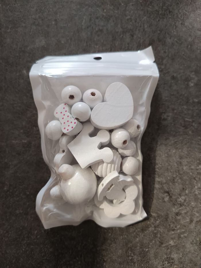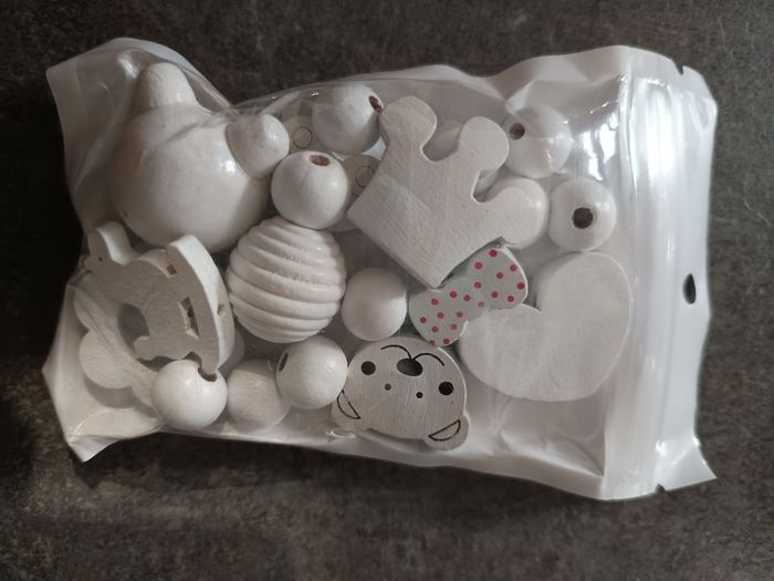 Kit de perles en bois blanches contient : - des perles rondes de différentes tailles - une tête d'ours - un noeud avec pois roses - une couronne - une voiture - une fleur - un cheval à bascule - un coeur - une tête avec des oreilles Ne contient pas le fil ⚠️ NEUF jamais ouvert !