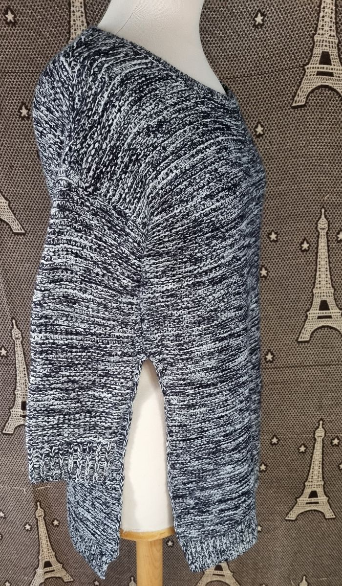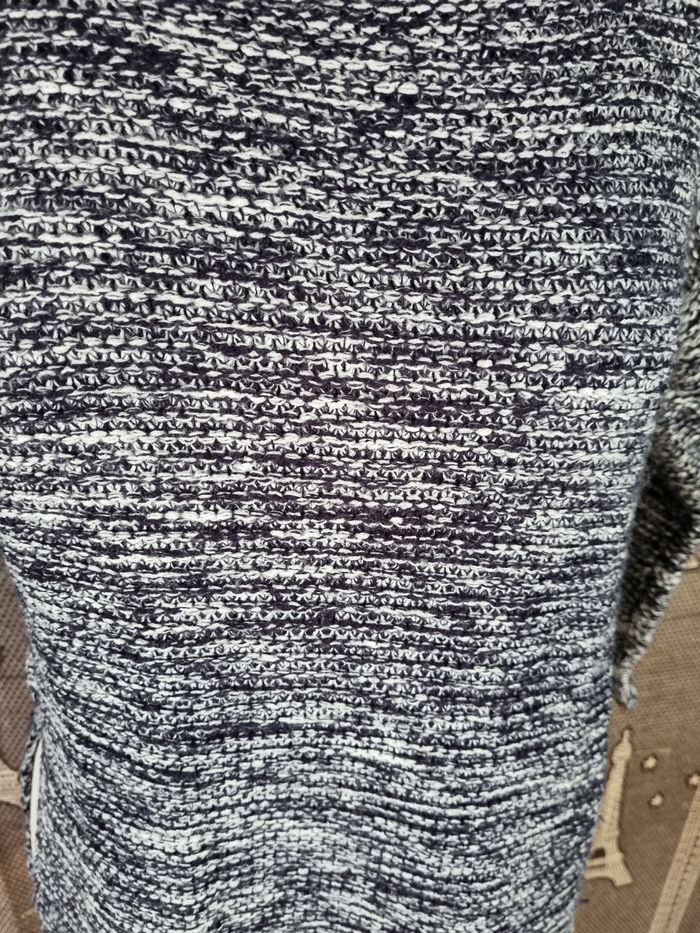 Pull chiné marine et blanc ,taille XS marque Jennyfer,style fendue sur les côtés, longueur 67cm, largeur 44cm, longueur épaule à aisselle 16cm, largeur aisselle à aisselle 51cm, longueur manche 31cm.