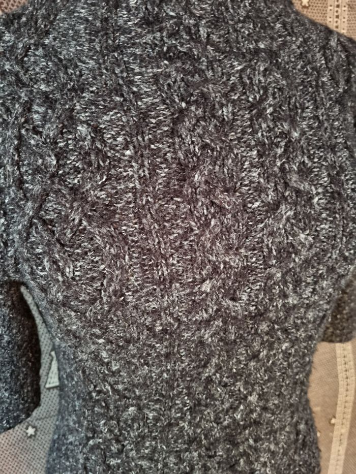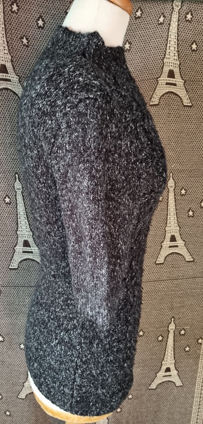 Pull noir chiné à manches ¾,taille S marque Promod, longueur 60cm, largeur 37cm, longueur épaule à aisselle 22cm,largeur aisselle à aisselle 41cm ,longueur manche 16cm.