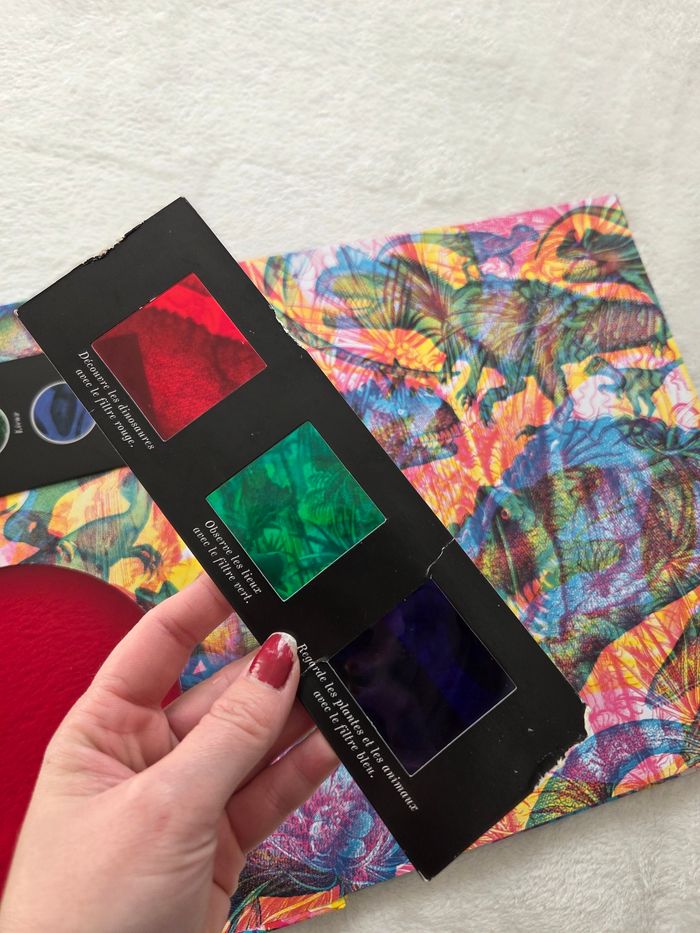 Livre magique 3 en 1 Les pages sont comme neuve, acheté en avril 63 pages sur le monde des dinosaures a observé avec le filtre magique qui lui est en bon état voir photo mais fonctionnelle Prix achats 25€