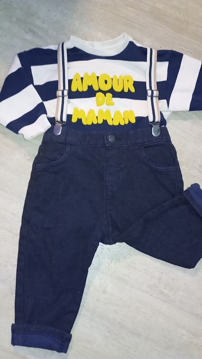 Ensemble garçons taille 18 mois pour le haut et le bas , tape a l'oeil , petit trou sur le pull du au retrait de l'étiquette voir photo, carton JMF
