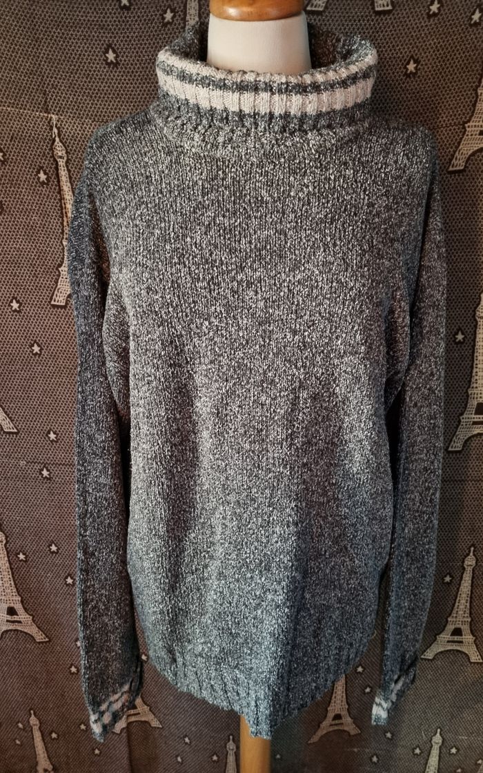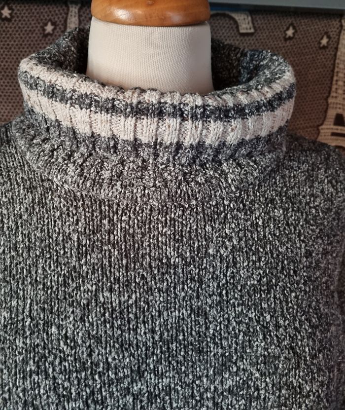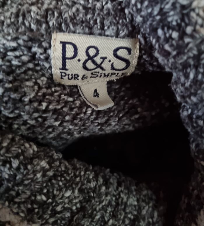 Pull d'hiver à col roulée gris chiné beige,taille 4 marque Pur & Simple,longueur 69cm, largeur 57cm, longueur épaule à aisselle 24cm, largeur aisselle à aisselle 57cm, longueur manche 55cm.
